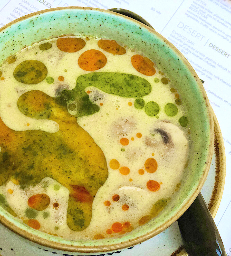 Večeru u prepunom Maguru počeli smo lijepo aromatičnim tom kha gaiem, koji se kuha s lišćem kaffir limea i s galangalom umjesto đumbira. Humus od edamamea imao je dobro pogođenu kremasto zrnatu teksturu, atraktivnu zelenu boju i naglašeniji okus, nego kad jedete same bobice edamamea.