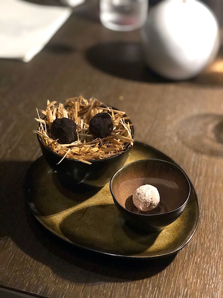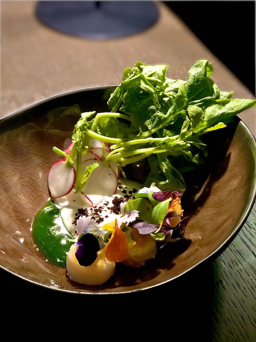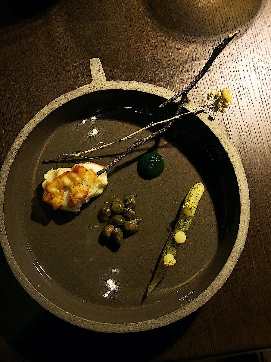 Primjerice, rajčicu s bosiljkom i zelenim čajem mogli ste doslovno razrezati na zadimljeni okus consommea od zelenog čaja, zeleni slatki okus tankog filma od bosiljka i slatko kiseli okus ljetnih rajčica, ali je sve to izvrsno funkcioniralo zajedno. Drugim amuse bouchem naizgled su dominirale ukiseljene, jako hrskave šparoge, ali su ih ubrzo dostigli granita od limuna i gel od četruna, dok je treći amuse bouche, pesto od motara s kiselim vrhnjem i čipsom od krumpirove kore, bio neodoljiv primjer street fooda propuštenog kroz filtere visoke kuhinje.