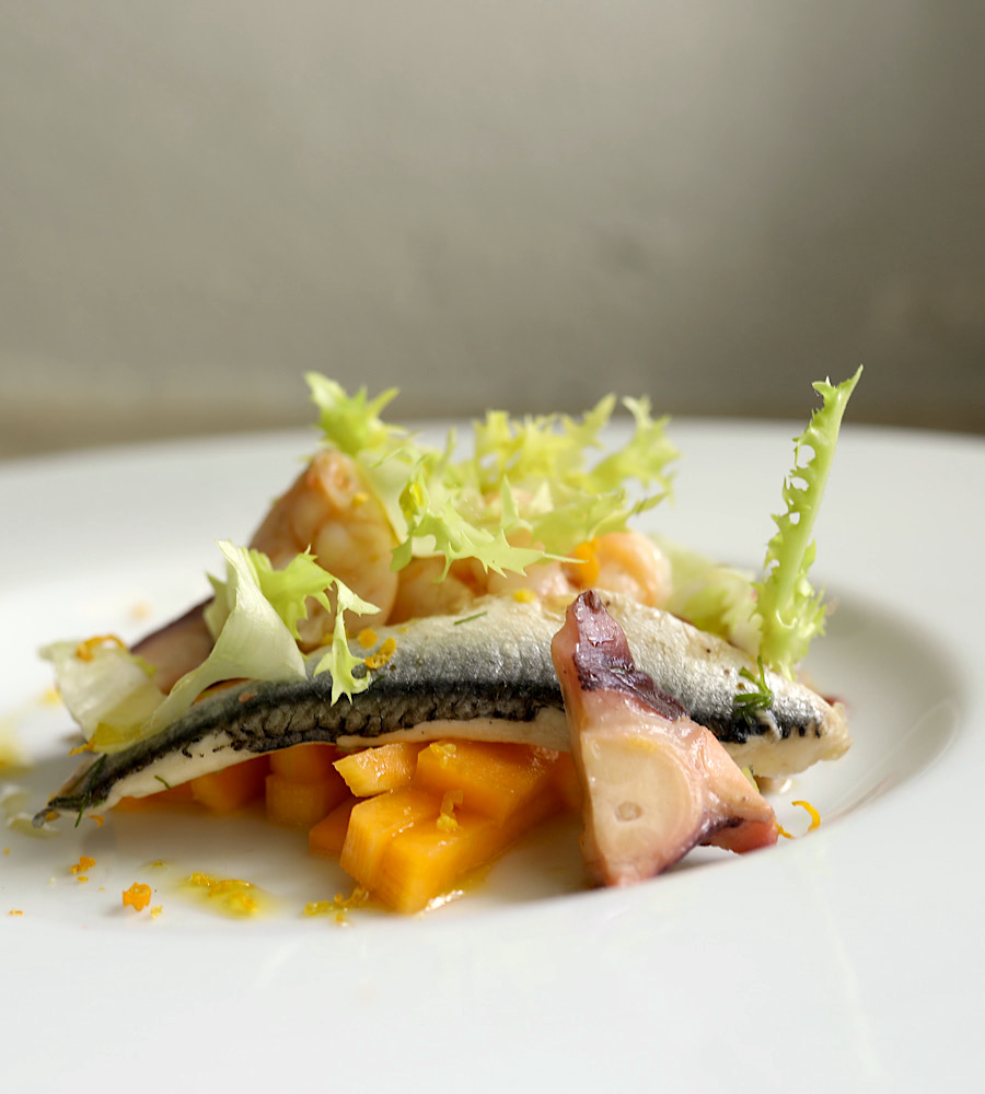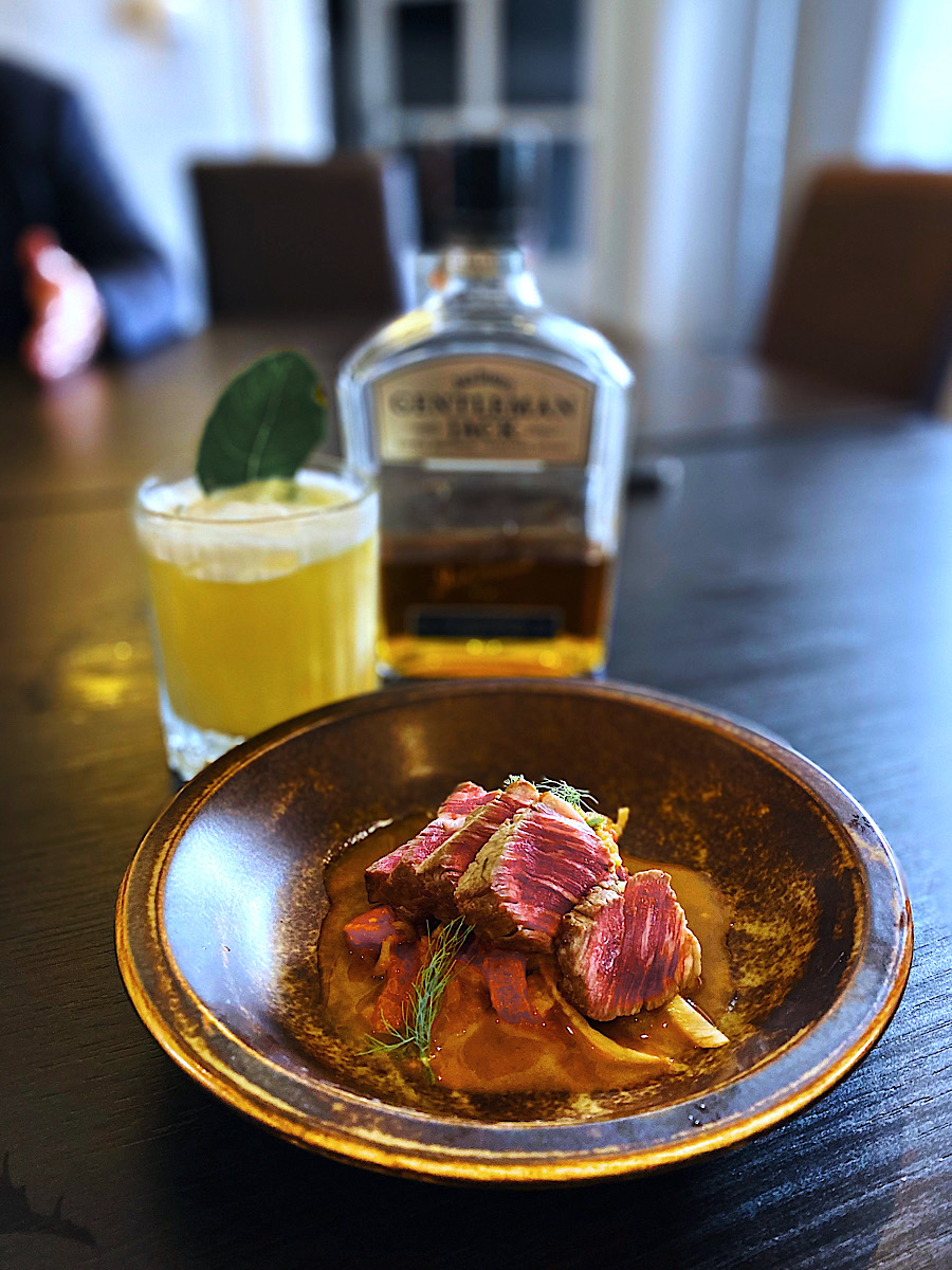 Blago zapečeni carpaccio od boškarina (zapečeni carpaccio potencijalno je ultrakomercijalna forma koju gotovo nitko ne koristi) posluživao se sa sourom od Gentleman Jacka, uljem od istarske bjelice, bazgom i pjenom od bjelanjaka. Ovaj je pairing ispao gotovo perfektno, te je pokazao da se istarsko maslinovo ulje može pretvoriti u dragocjeni sastojak za koktele, koji glatko povezuje kompleksno pripremljenu hranu s jakim alkoholima.