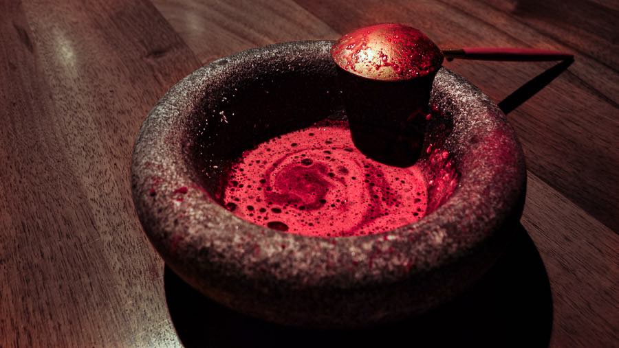 Razinu spektakla podiglo je tehnički komplicirano jelo koje se sastojalo od tanke pločice cikle posute prahom cikle, sladoleda od hrena i intenzivnog kozjeg sira. Sir i hren stvorili su dosta dramatičan ali užitan konflikt okusa, dok nas je pločica cikle vizualno i teksturalno podsjetila na pločicu kozice iz Disfrutara, koja je bila izašla iz 3D printera.