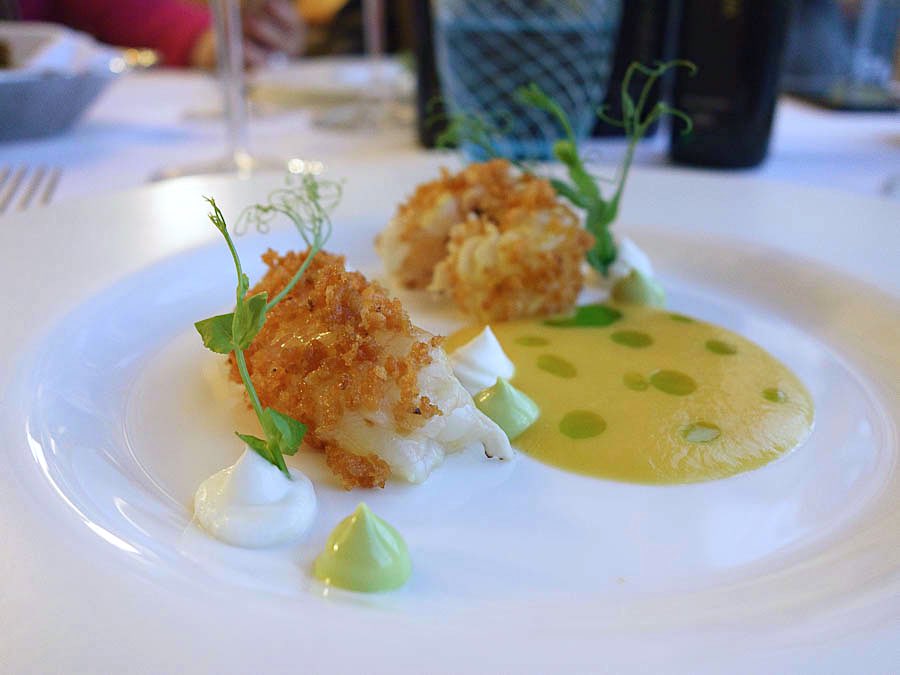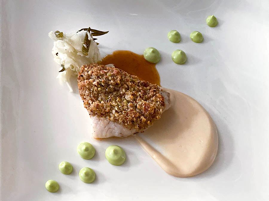A onda je na red došao glavni junak naše glavne fotografije, kolosalni kovač. Chefovi Plavog podruma servirali su prst debele šanpjera s koricom od pistacija, u društvu ribljeg demi glacea i majoneze od crnog češnjaka . Riba je imala savršeno podatnu, svilenkastu teksturu, puno sočnosti i delikatan, elegantan okus. Uz ovaj fenomenalni ručak, pili smo među ostalim podjednako fenomenalni chardonnay Belle Cote Petera Michaela.