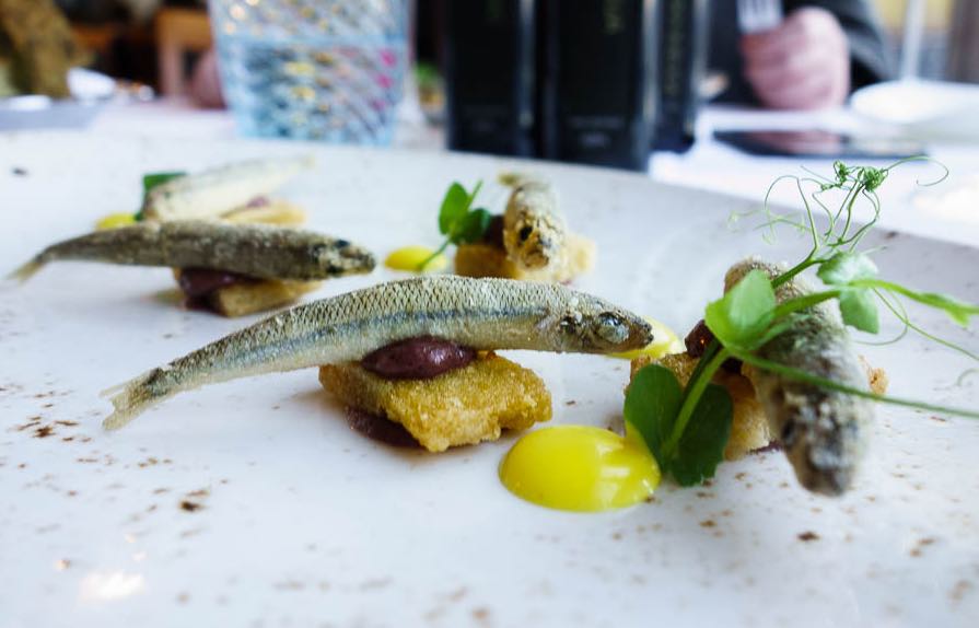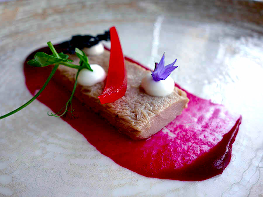 Kasni ručak u Plavom podrumu počeli smo konfitiranom pancetom debele, 91 kilogram teške tune koja se topila u ustima, i uz koju je odlično pristajao lagano oštri umak od hrena. Hrskavi gavuni lijepo su i neodoljivo kasnojesensko tradicijsko jelo, ovaj put sasvim malo promijenjeno pločicama od slanutka. Vrhunske, jako mineralne kamenice servirane su s ukiseljenom čičokom, što ih je dodatno podiglo. Slatki repovi velikih škampa posluženi su gotovo sirov , osim što su s gornje strane gratinirani hrskavim crumbleom od škampa. Crumble od škampa dobiva se ribanjem oklopa škampa. Riječ je o jednoj od inteligentnijih vrednovanja škampa koje smo probali.