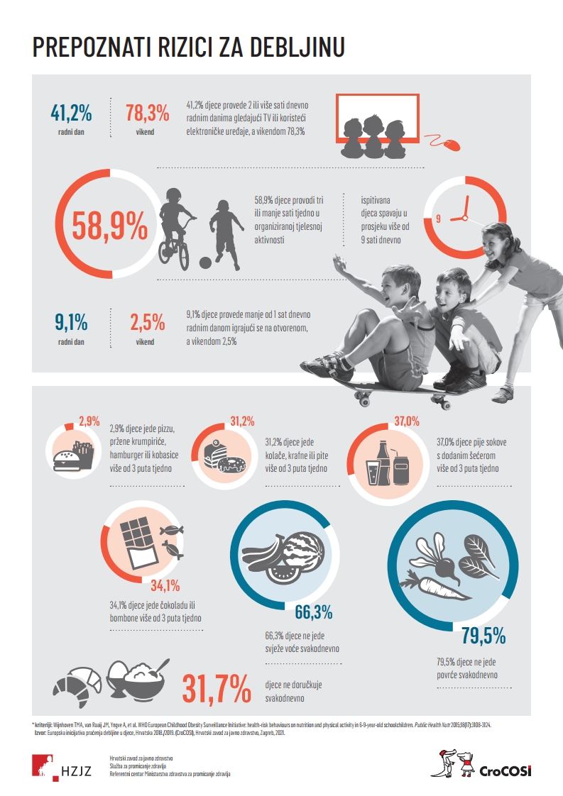 Istraživanje je pokazalo da 35 posto djece dobi od 8 do 9 godina u Hrvatskoj ima višak kilograma, i da je problem izraženiji kod dječaka nego kod djevojčica. Uzroci bi se mogli sažeti kao kombinacija stila života, loše prehrambene kulture roditelja i nedostupnosti zdravih opcija u školama i prostorima u kojima djeca provode značajnu količinu vremena.
