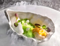 Ručak u oblačnom i toplom Voloskom počeli smo sa sirovim škampima koji su, naravno, sami po sebi genijalni, u društvu muštarde od cvjetova maslačka s emulzijom od Ipšina leccina. Slijedila je jako mineralna trilja marinirana u naranči i marakuji, servirana na kremi od kukuruza i okružena delikatnim ajom blancom.