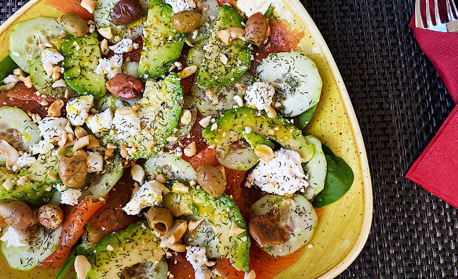 Osim pizze, Basta priorema i niz hladnih narezaka, miješanih plata kao i velike salate. Naručili smo salatu s dimljenim lososom i avokadom, koja je bila golema i ukusna: avokado je bio putrast i zaista odličan, losos solidan, krastavci hrskavi a indijski orasi dali su lijep dodatni dodir ovom zasitnom a opet superzdravom jelu.