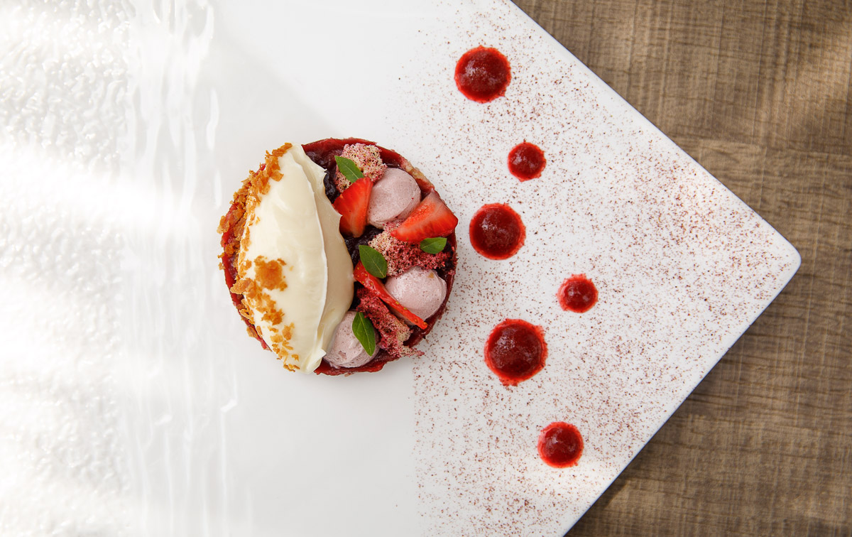 Gazpacho je zapravo dekonstruirani tanjur koji se sastoji od lubenice s kravljom skutom, i niz kremastih točkica koje predstavljaju esenciju gazpacha. Ovo je jelo opet lijepo, jako osvježavajuće i možda najuspjelije s vegetarijanskog menija.