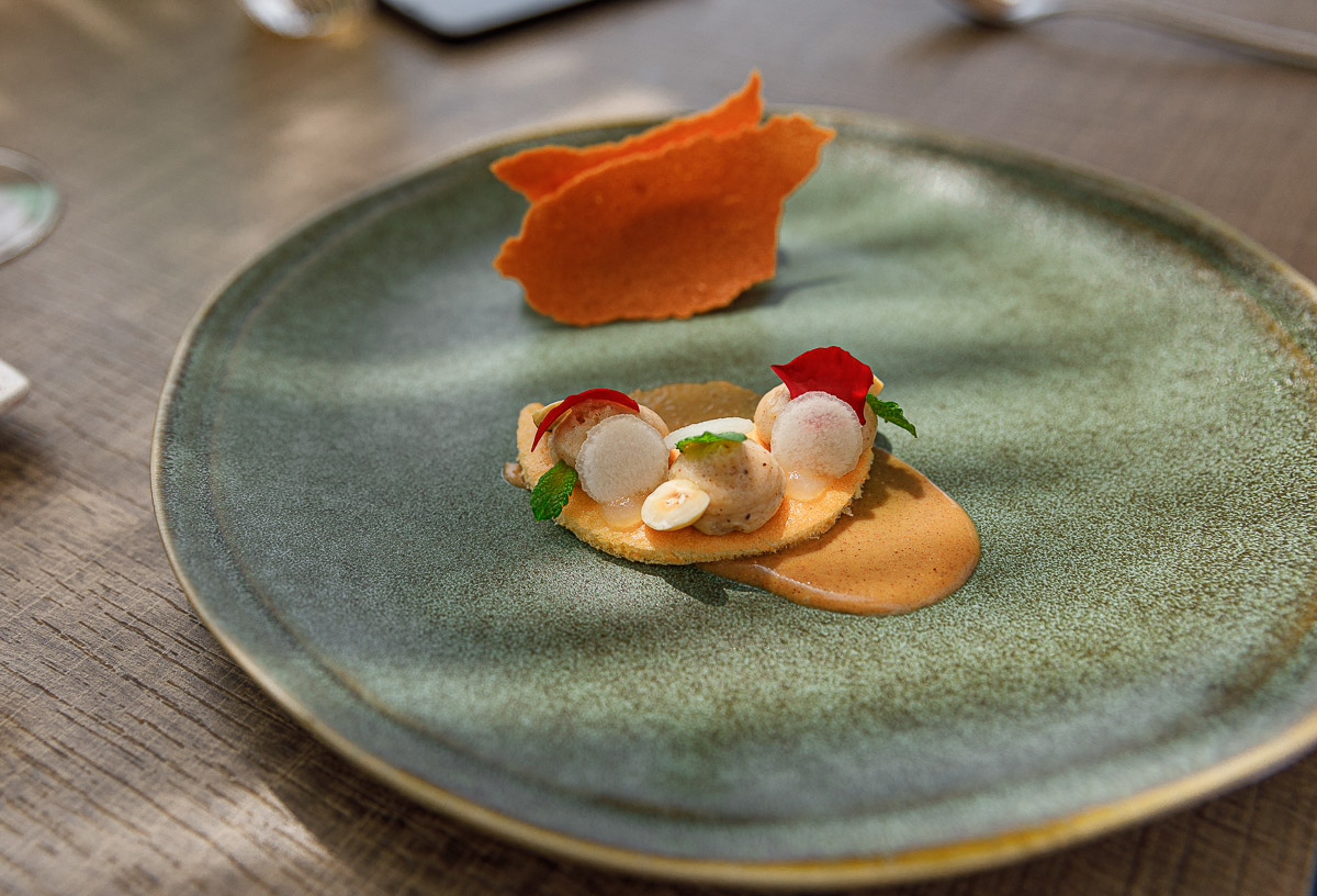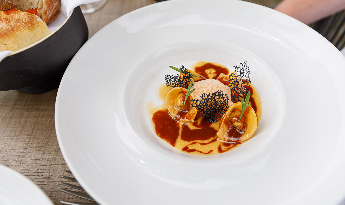Deep Blu otvara se zaista odličnim škampima, serviranima s majonezom od hibiskusa i bazge, i s cvjetovima bazge. Blaga herbalna slatkoća bazge izvrsno se slaže s mineralnom slatkoćom perfektno očišćenih škampa. Mislili smo da su škampi s hibiskusom i bazgom jelo dana, dok nismo dobili cappellette punjene hlapom, s jako bogatim, baš intenzivnim bisqueom od hlapa i estragonom. Ovo je jelo mnogo robusnije od sveg drugog što smo probali u Blu, ali je zaista prvorazredno.