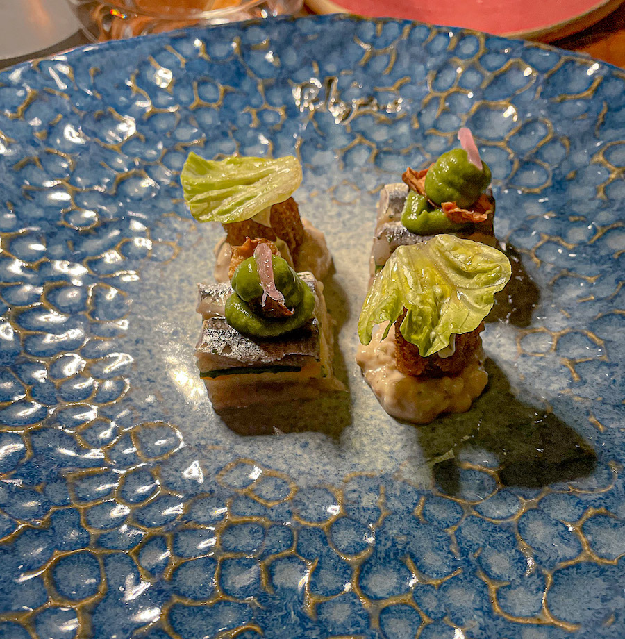 Jučerašnja večera u Pelegriniju počela je osvježavajućom, mineralnom šibenskom kamenicom iz bočate vode, s đumbirom i granitom od limete. Slijedili su gazpacho s lokalnim sirom, krema od bakalara, izvrsna salata od hobotnice akcentirane kaparima i fantastično duhovit i jako ukusan miniburger punjen, vjerovali ili ne, dagnjama.