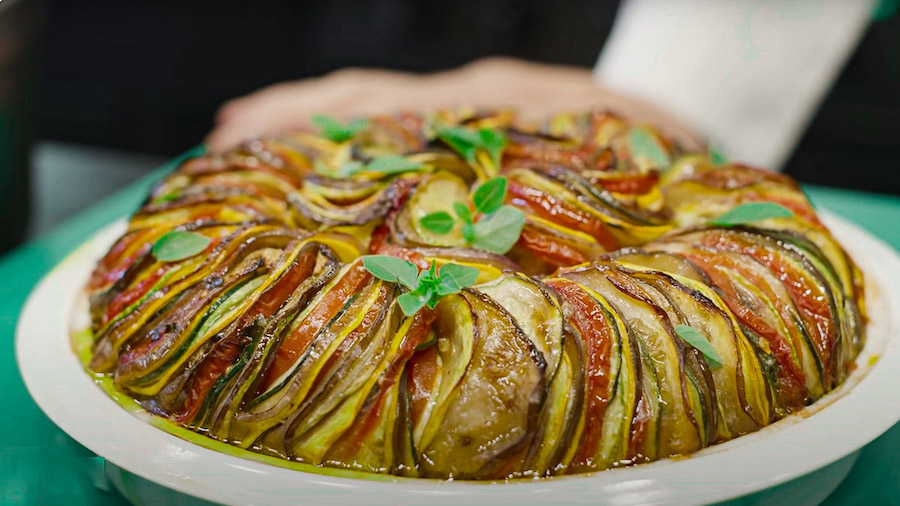 U svakom slučaju, riječ je o velikom francuskom kulinarskom izumu koje su rekreirali vjerojatno svi najvažniji francuski chefovi. No ovoga smo puta odabrali recept Martina Ruggierija, zamjenika Yanicka Allenoa u pariškom Ledoyenu. Zašto ratatouille talijanskog chefa? Zato što upravo Ruggierovo porijeklo ratatouille definira u širem kontekstu, kao mediteransko jelo, koje podsjeća na talijanske caponate i marokanske tajine. Ruggieri svoj ratatouille i priprema u tajineu.