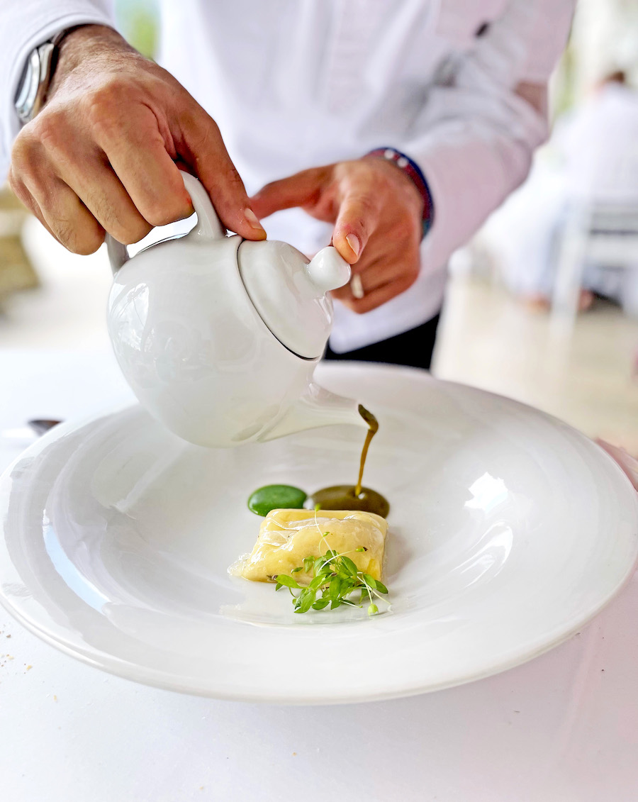 U šest ili sedam slijedova koje smo dobili još su se posebno, uz zubaca i hobotnicu, istakli ravioli punjeni gusjom jetrom, s tankom trakicom larda i četiri forme peršina. Ravioli su bili savršeno precizno kuhani, fenomenalno bogati a opet elegantni i lagani, jer je peršin ublažio masnoću gusje jetre.