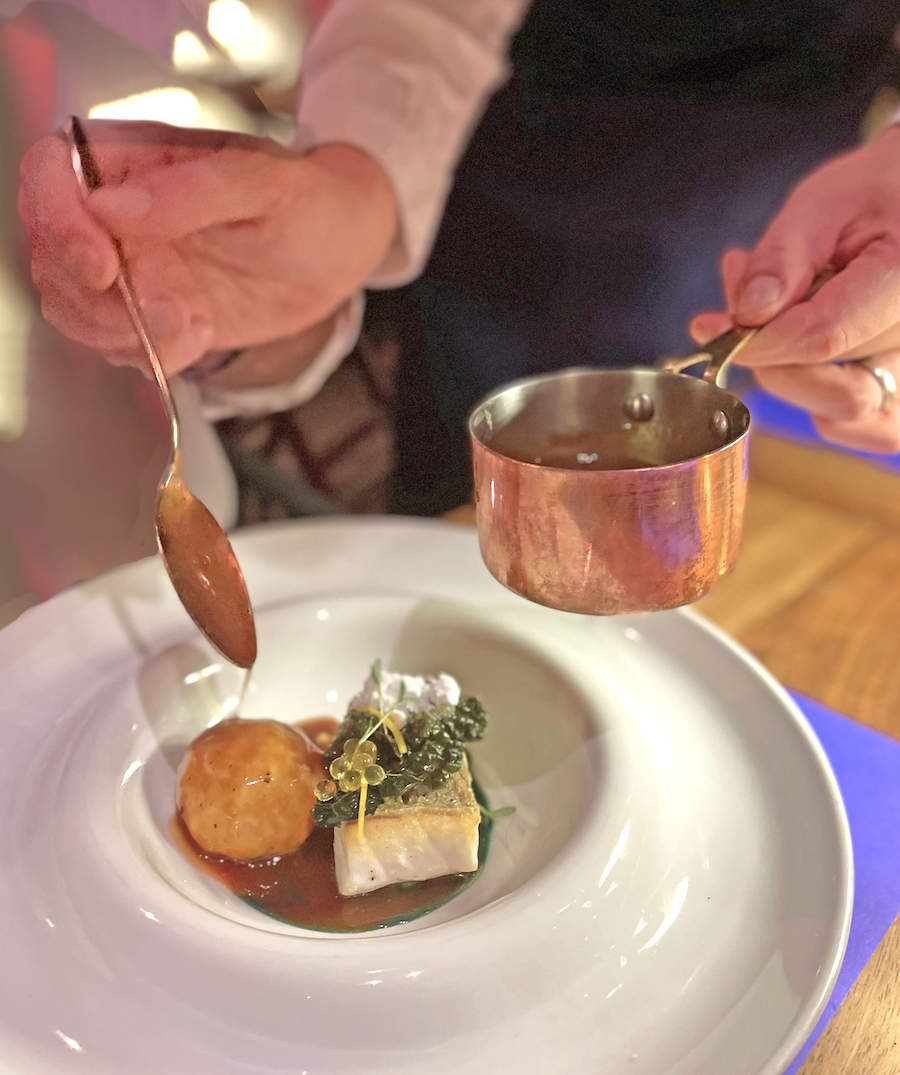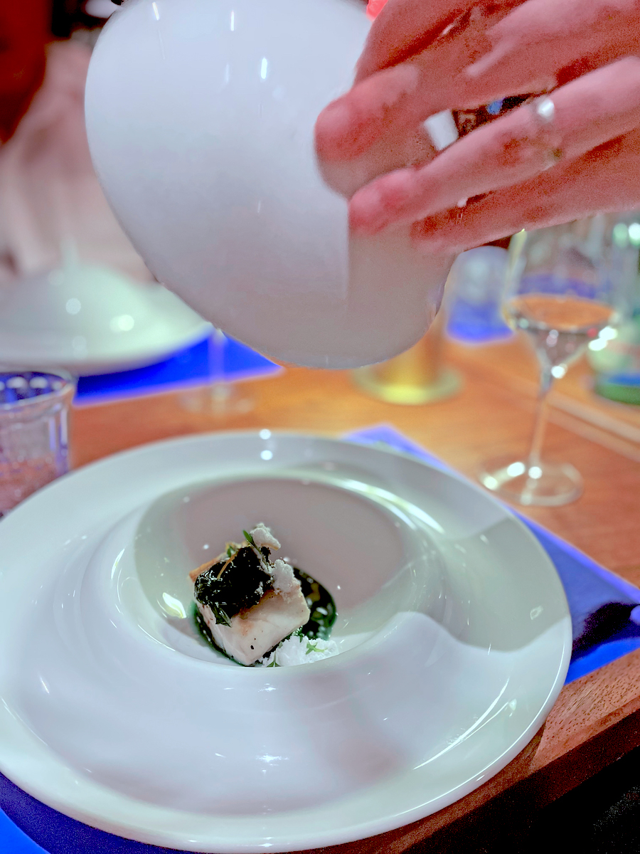 Savršeno pečeni file brancina s kožom hrskavom poput čipsa, plivao je u koncentriranom ribljem demi glaceu u društvu knedle kuhane na pari i punjene šarmantnom kombinacijom sipe i crne slavonske svinje. Desert je na stol stigao u poštanskom paketu koji je čuvao tiramisu s Valrhonom i crnim kardamomom zarobljen u staklo od puhanog šećera.