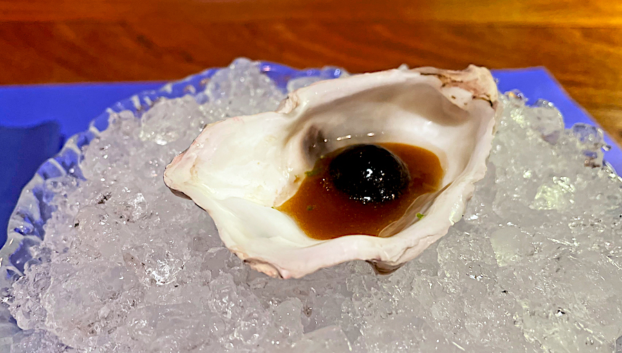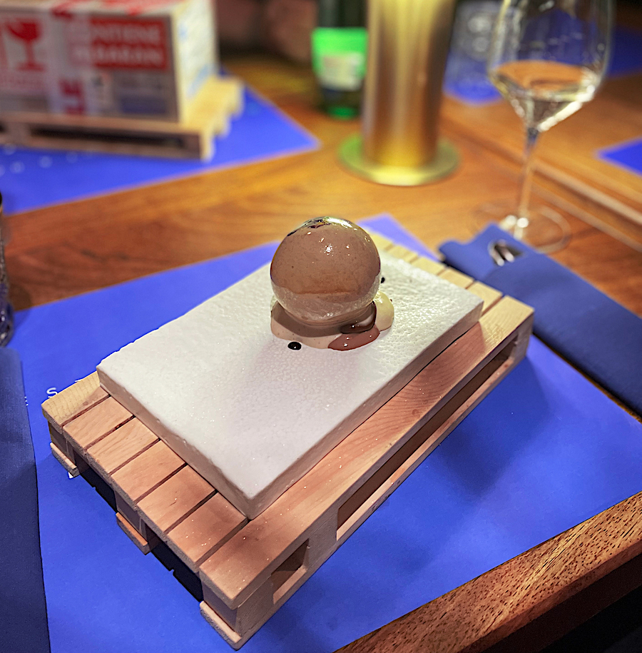 Slijedio je genijalni ježinac s tartarom od škampa, vinaigretteom od korijandera i pjenom od limete; radi se o jednom od najboljih jela s Đuraševićeva menija. Moramo, međutim, priznati da ni velika crna sfera od kamenice nije daleko.