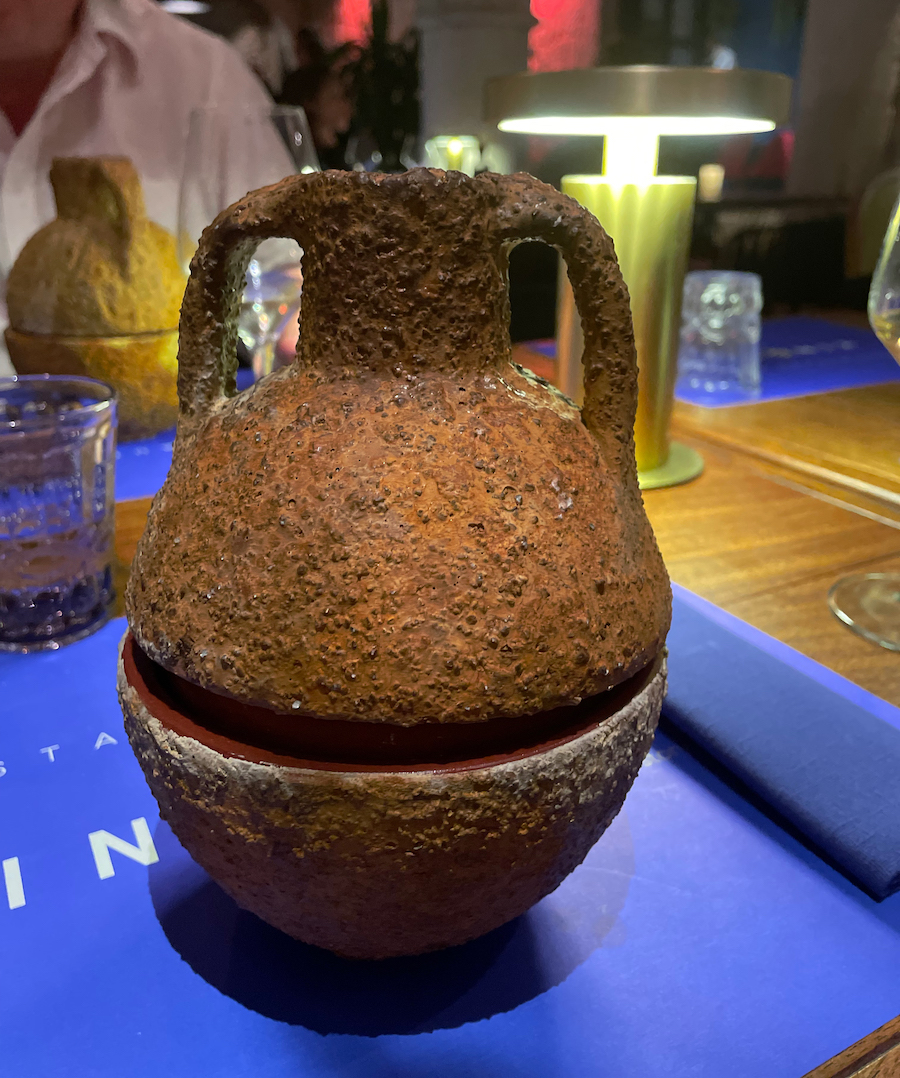 Večeru smo počeli bonsaijem s kojeg su visile “masline”; zapravo praline od kakao maslaca oblikovane kao masline pune električnog, slanog soka od maslina. Uz malo maslinovo stablo zasađeno u zemlju od crumblea od badema, dobili smo i minijaturnu teglicu jako ukusnog chawanmushija s oscietra kavijarom.