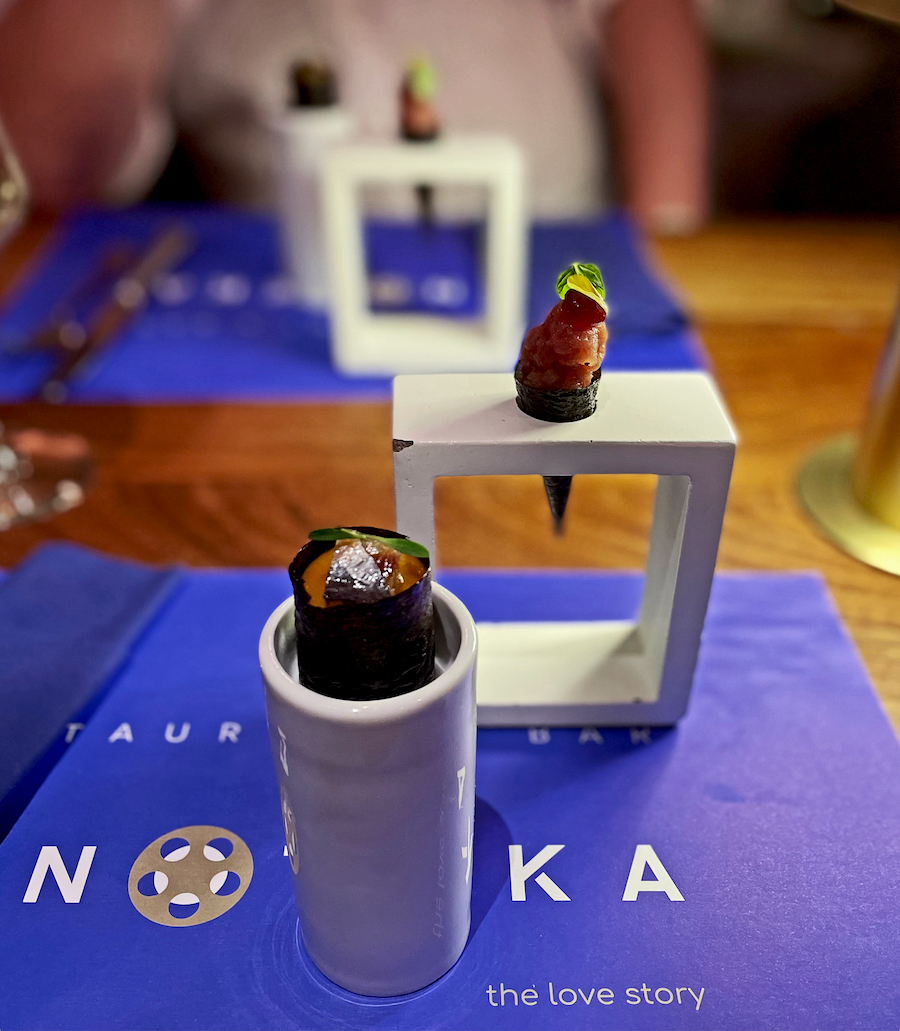 Gunkan s dimljenom srdelom, mangom i pralinom od badema, i tenaki s torom i emulzijom višnje spadaju među maštovitije primjere pristupa sushiju, dok je salata od grancigule s ukiseljenom zelenom jabukom, korijanderom i avokadom nježna i elegantna, s naglašeno čistim okusom rakovice.