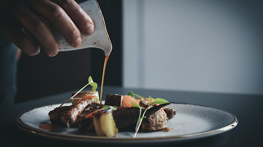 Meni na sinoćnjoj večeri sastojao se od pet logično složenih sljedova: plava tuna s kimchijem i hladnim rezancima sa sipinim crnilom, vrganji s dva sira iz Kumparičke. romb s tartufima i ikrom pastrve, goveđe rebro s palentom i pečenim kukuruzom, tamna čokolada s maslinovim uljem i mandarinom.