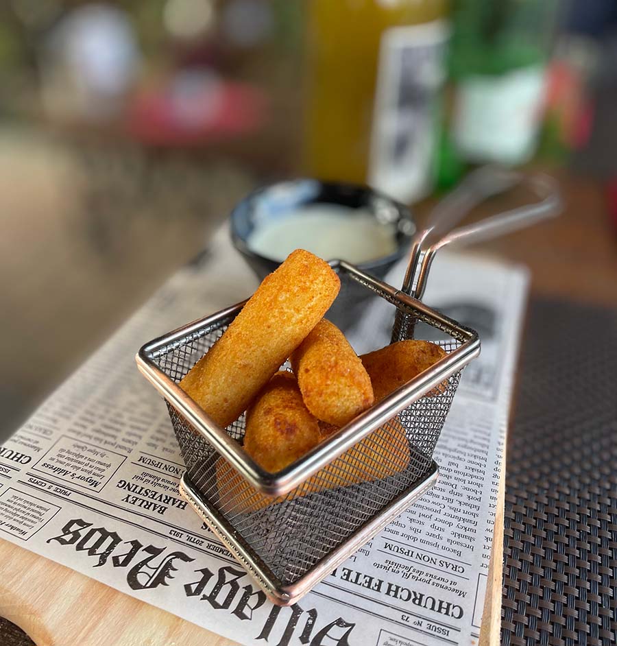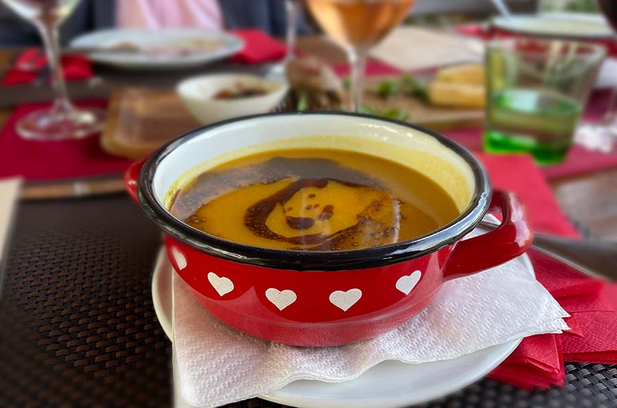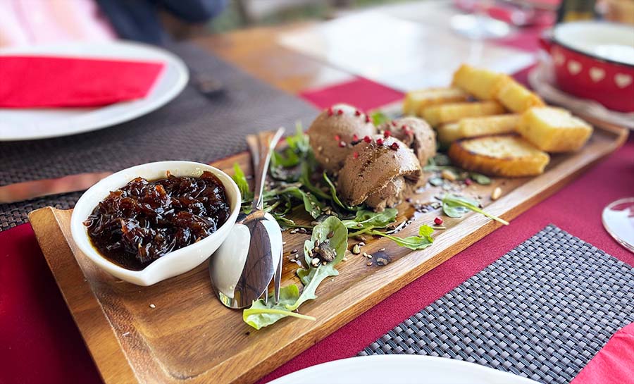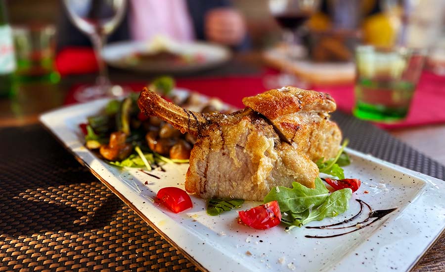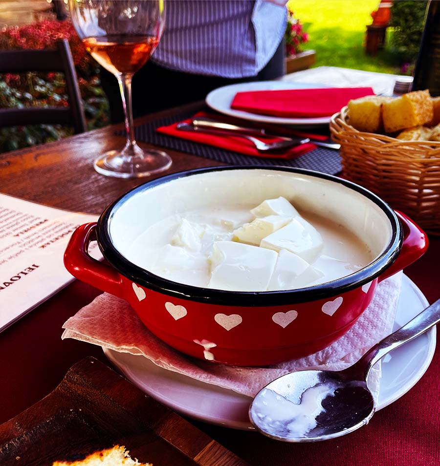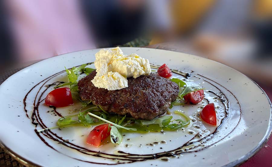 Mi smo probali zbilja odličan sir s finim zapečenim kruhom, parfait od pileće i pačje jetre i izvrstan, kiselo-slatki pikantni džem od luka. Zatim smo još pojeli odlično začinjenu, premda nažalost lagano prepečenu janjeću pljeskavicu s kajmakom, i gigantski teleći kotlet s korom od parmezana i bjelanjka. Uz meso su nam servirali ukusne domaće krokete s umakom od sira.