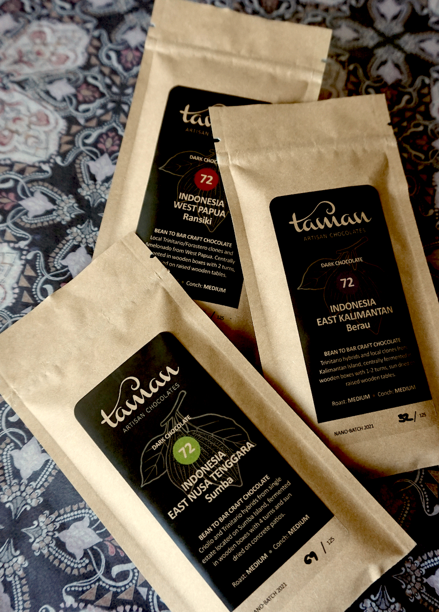 Tri Taman bean-to-bar čokolade koje smo kušali na neki način pokazuju budućnost kakaa iz Indonezije. Vladović i Kahlina sami rade sve faze procesa, od traženja dobavljača i prženja kakao zrna do finalnog proizvoda. “Sve tri čokolade u indonezijskoj seriji namjerno smo napravili istom metodom. Sve imaju iste parametre: 72 posto suhe kakao tvari, isti stupanj prženja kakaa, isto vrijeme i temperaturu končiranja, istu količinu šećera. Radili smo tako da bismo pokazali koliko terroir utječe na kakao i čokoladu od regije do regije,” kaže Sanja Vladović. Fokusirai su se na novije i relativno nepoznate regije.