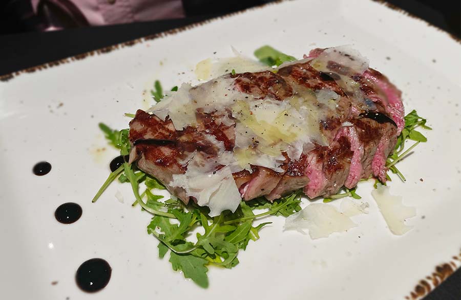 Naručili smo tagliatu od američkog black angusa, i steak od tune s puno povrća. Govedina je bila vrlo dobro pečena, ružičasto crvena sa snažnim mesnim okusom. Međutim, stigla je na hladnom do mlakom tanjuru, što nam je nerazumljivo. Svaki profesionalni kuhar mora znati da se steakovi serviraju na vrućim tanjurima. To je jedno od temeljnih pravila rada s mesom. Osim toga, tako dobro meso traži umak ili dva sa strane, poput, recimo , bearnaisea. Mi smo dobili ribeye bez umaka.