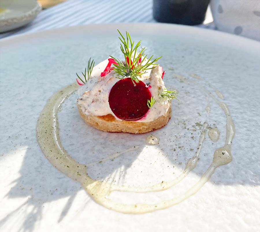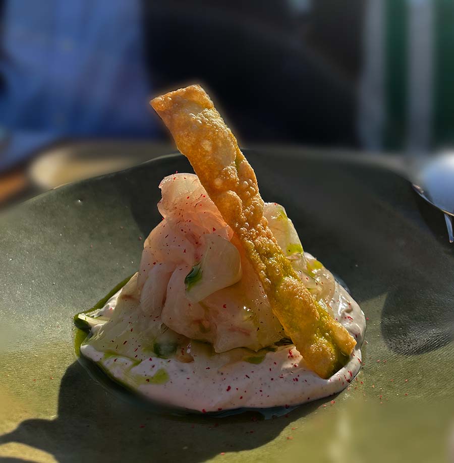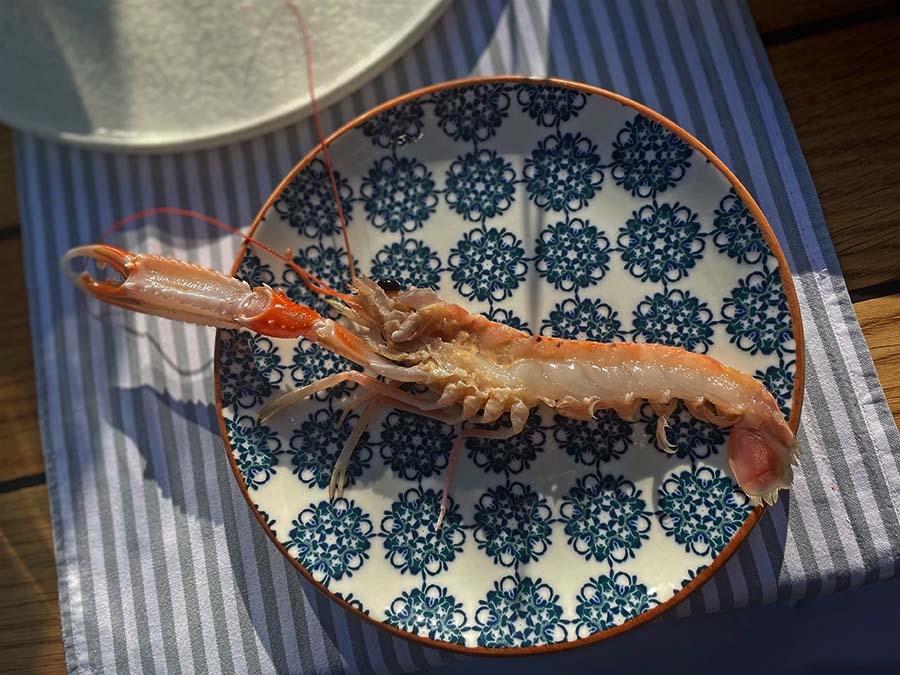 Uzdužno prepolovljeni sirovi cijeli škamp imao je još toplo meso jer je, pretpostavljamo, do posluživanja bio živ. Sirovi repovi škampa servirani su s mladom skutom što je uobičajeno, ali i s elegantnim umakom od glava škampa. U carpacciu od brancina, riba koja je prošla blagi tretman gravlaxa poslužena je na puno komorača, s još svježeg kopra.