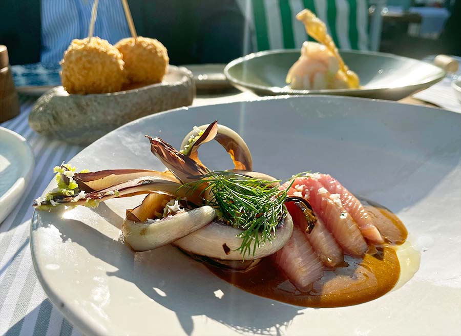 Debele fete palamide rezane kao za sashimi kupale su se u crvenosmeđem blago pikantnom umaku, u kojem je bilo wasabija. Uz palamidu je serviran gorki radič trevigiano. Ujutro izvađene jakovske kapice poslužene su s indijskim orasima i tehnički besprijekornim holandskim umakom. Jedino su kuglice od bakalara ostale iste kao prije par godina, što je ispravno jer se radi o potpisnom jelu.