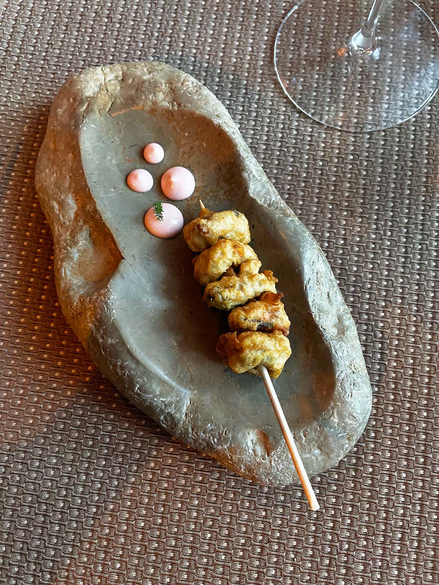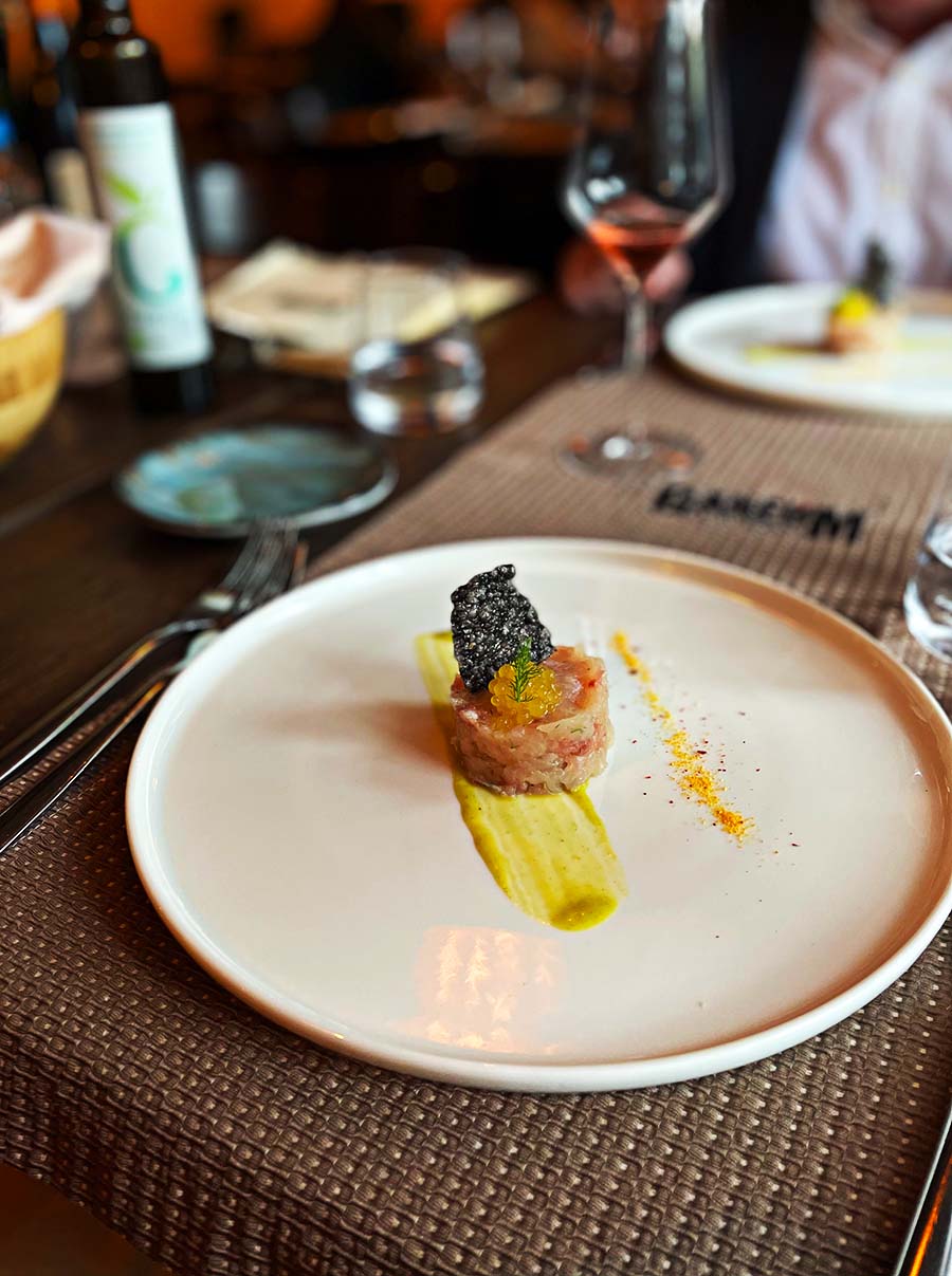 Ručak u Ganeumu počeli smo inćunima na mariniranom luku s grožđicama. Ovo klasično jelo bilo je tehnički točnije napravljeno nego u većini kvarnerskih restorana; luk je posebno briljirao. Tartar od orade profitirao je na mineralnoj kremi od salikornije i slatko kiselim narančinim sferama.