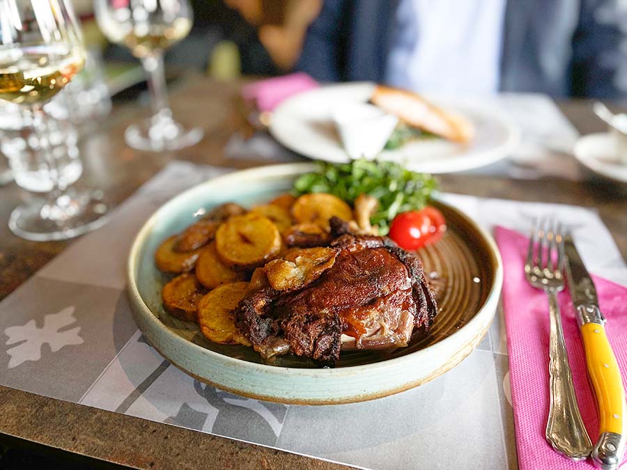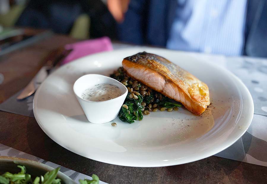 Confit od patke, jedno od najtipičnijih francuskih jela uopće, bio je mekan i slastan, poslužen s rikulom i pečenim krumpirima. File lososa serviran s lećom imao je lijepo hrskavu kožu, ali sama je namirnica mediokritetska; vjerojatno bismo trebali prestati naručivati svježi losos.