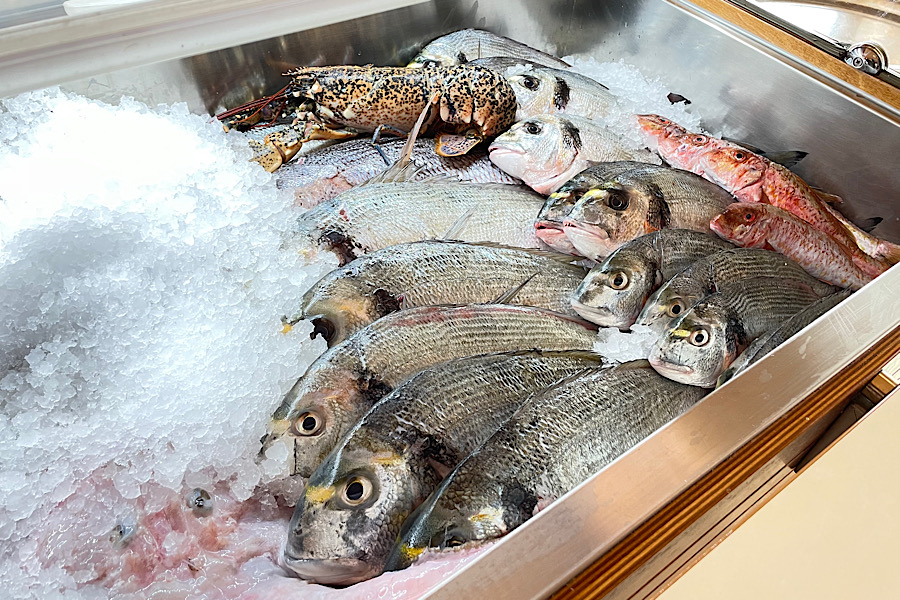 Zatim smo iz vitrine u kojoj su se još nalazile velike orade, kovači i nešto manji listovi, izabrali nekoliko trilja od kamena. Trilje su bile perfektno pečene, pune joda i poslužene s precizno kuhanom blitvom s krumpirom. Ovo ističemo zato što u mnogo restorana blitvu prekuhaju do nejestivosti.