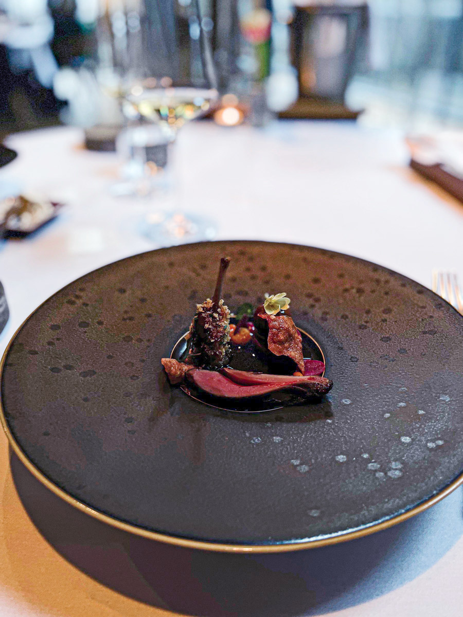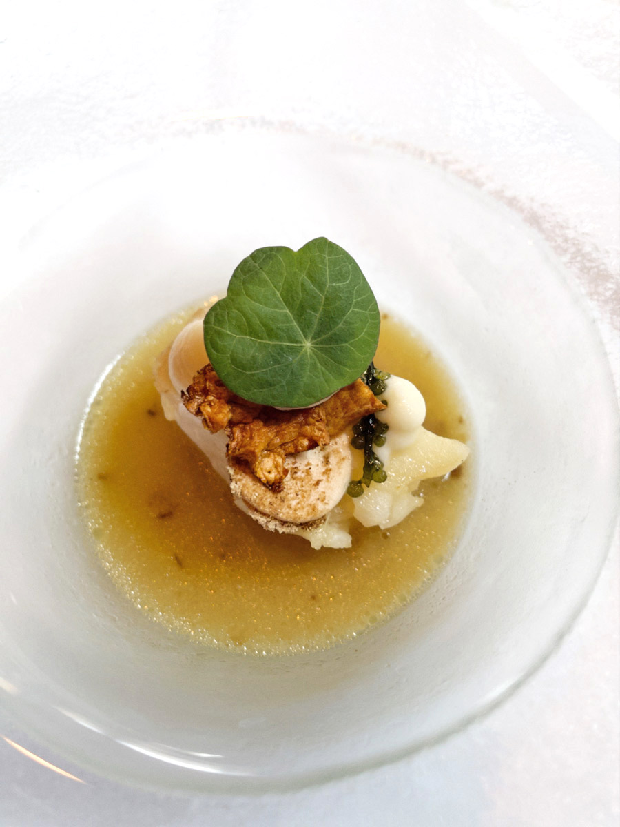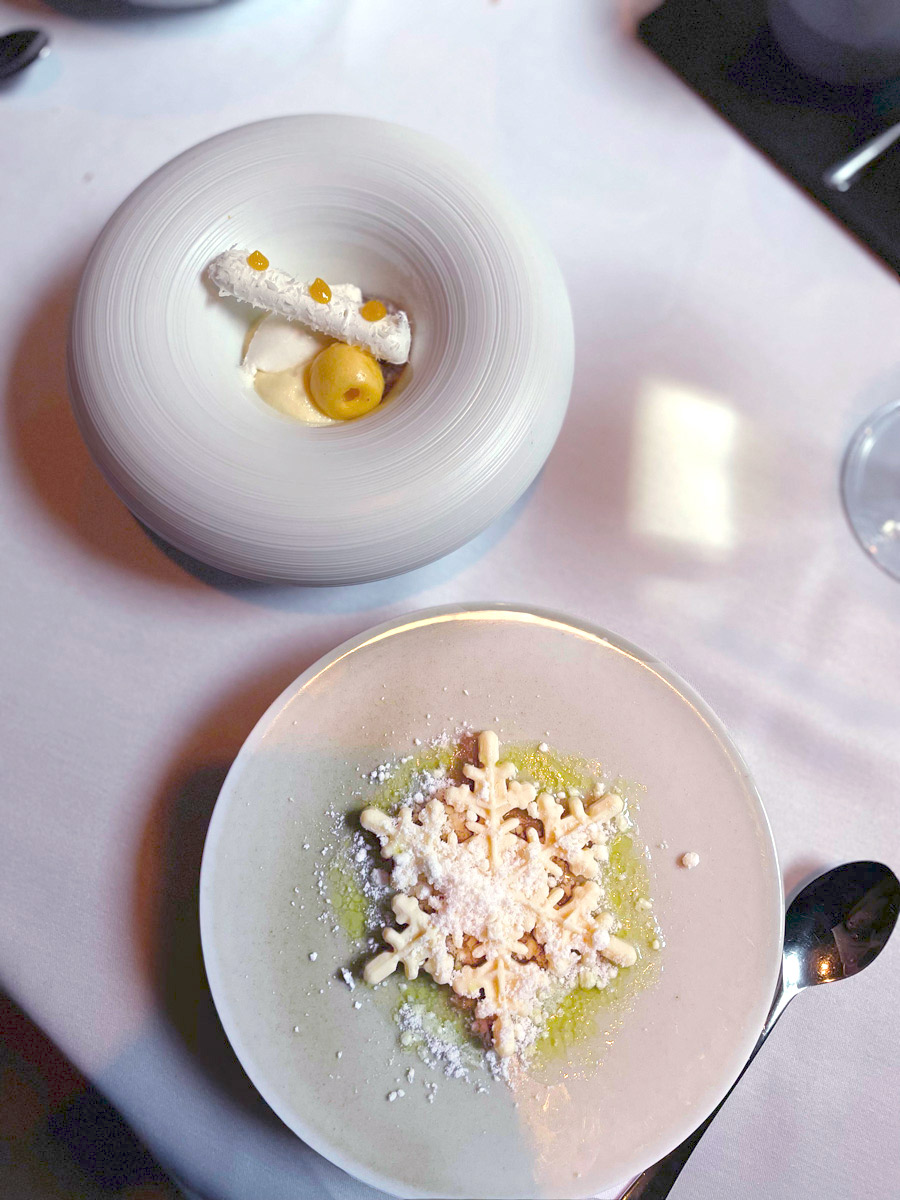 Svježi bakalar u juhi/umaku od kamilice sa sirovim šampinjonima bio je tehnički precizno skuhan, ali posve bezokusan. Jelo od jakovskih kapica, s puno povrća, bilo je kompleskno u strukturama i teksturama, ali opet razmjerno neutralno . Oslić s misom i smeđim maslacem bio je, pak, genijalan. To je jedino jelo zbog kojeg bismo se vratili u Hišu Denk. Oslić kao da nije došao iz iste kuhinje: radilo se o jednom od najekspresivnijih i najzaokruženijih jela koja smo probali u zadnjih par mjeseci. Pileći file s albuferom, crnim tartufom i korabicom bio je bolji od 99 posto pilećih jela koja možete probati istočno od Bressea, dok se golub u umaku od kave s fantastično pečenim prsima, približio genijalnom osliću.