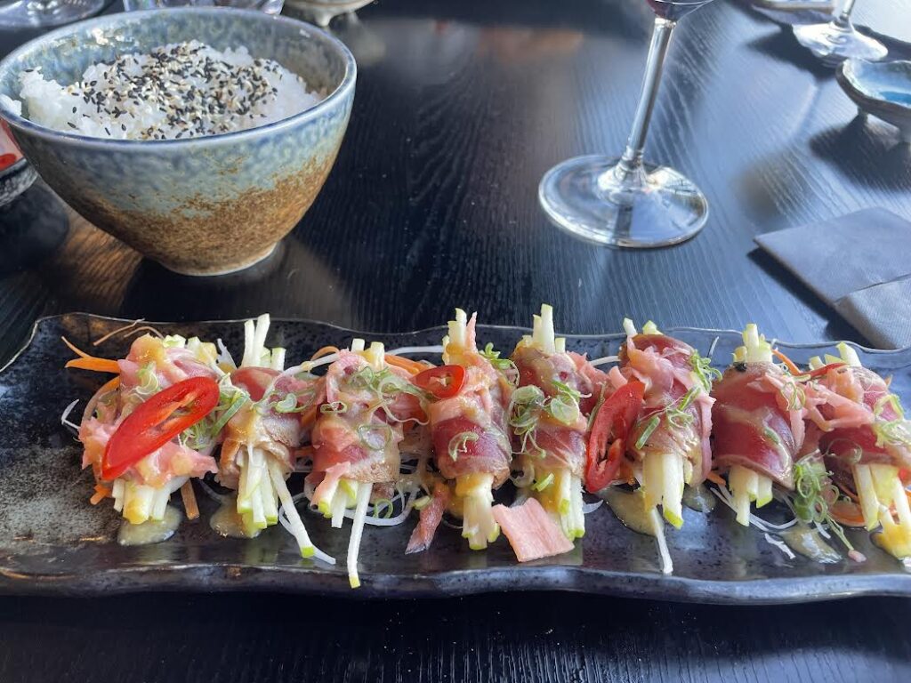Jučer smo u Izakayi dobili tataki u obliku rolica od tune, punjenih štapićima reske zelene jabuke, i položenih na mnogo precizno rezanog, mariniranog povrća. Ova osvježavajuća verzija tatakija pomalo mijenja definiciju cijelog jela, jer umjesto masnoće, snage i umamija klasičnog tatakija dobivate niz osvježavajućih elemenata s puno različitih tekstura. No, Izakayine rolice od tatakija, s voćem i povrćem, jako dobro fukcioniraju, samo što uz ovaj stil tatakija ne treba naručivati crno, nego bijelo vino.