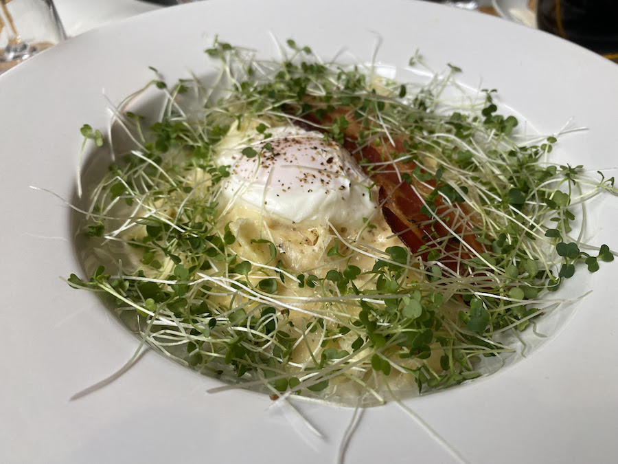Danas oko pola četiri naručili smo finu pileću juhu punu mesa i povrća, i tagliatelle s poširanim jajem i pancetom. Tjestenina je bila kuhana al dente, a jaje upravo perfektno poširano, s čipkastom opnom bjelanjka i tekućim, kremastim žumanjkom. Da su nas još pitali želimo li malo svježe naribanog parmezana, ovo bi jelo bilo perfektno u svom žanru.