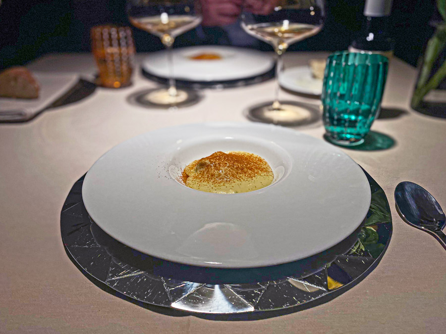 Među četiri sinoćnja pozdrava iz kuhinje posebno se istakla kremasta, bogata salata od orade s toliko čistim i jakim okusima da bi mogla funkcionirati kao samostalno jelo. Sardon je, pak, poslužen na keksiću koji je asocirao na amarete: kombinacija slatkog i ribljeg bila je stanoviti lajtmotiv jučerašnje večere.