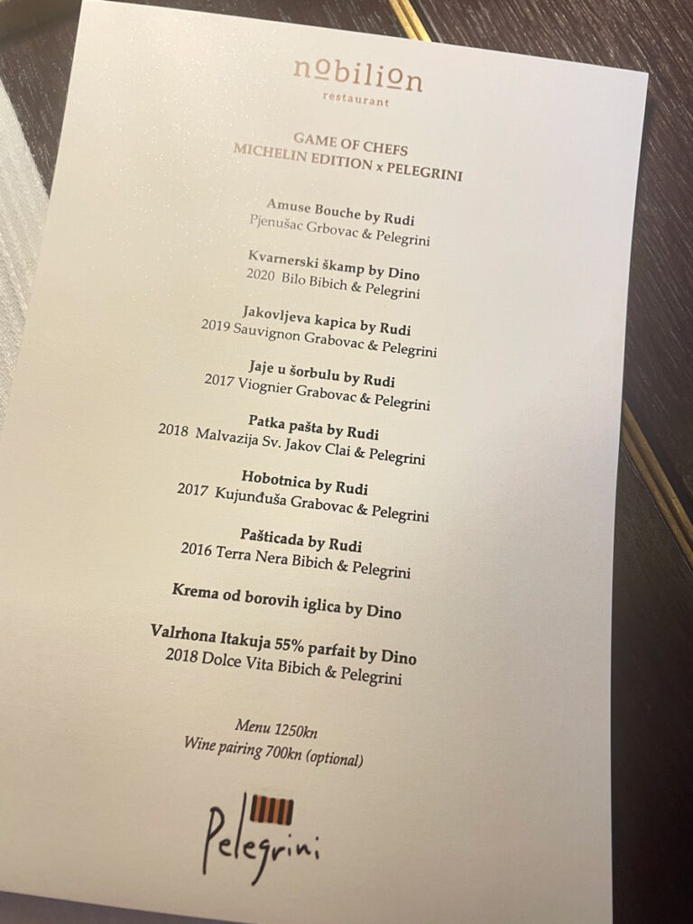 Budući da rijetko gostuje, logično je da Pelegrini svoju večeru u Ikadorovom Nobilionu u Iki održanu u sklopu programa Game of Chefs-Michelin Edition, nije htio odraditi rutinski, isključivo po best of načelu slaganja menija. Stoga se uz poznate Pelegrinijeve favorite poput patke pašte, na jučerašnjem jelovniku našlo i nekoliko briljantnih inovativnih jela.