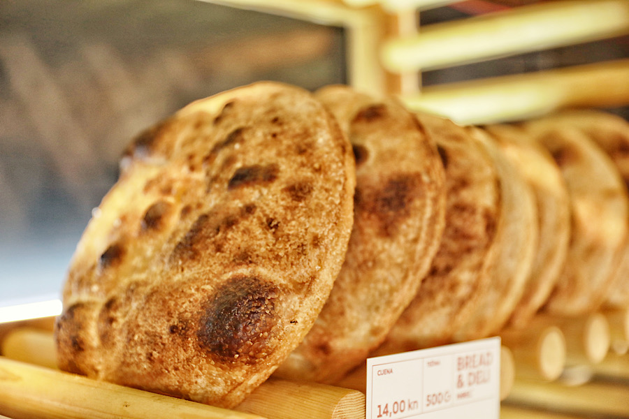 U ponedjeljak ujutro Noel Bread & Deli zanosno je mirisao po svježe pečenim hljebovima raznih vrsta kruha: od velikog pšeničnog, preko manjih ciabatta, hrskavih poluintegralnih baguettea, okruglih mliječnih peciva i velikih, focaccia s još većim, školskim rupicama, pa do fenomenalnog, teškog, vlažnog stopostotnog raženog  četvrtastog kruha koji košta 36 kuna i nesporno vrijedi toliko. Svi se kruhovi baziraju na kiselom tijestu.