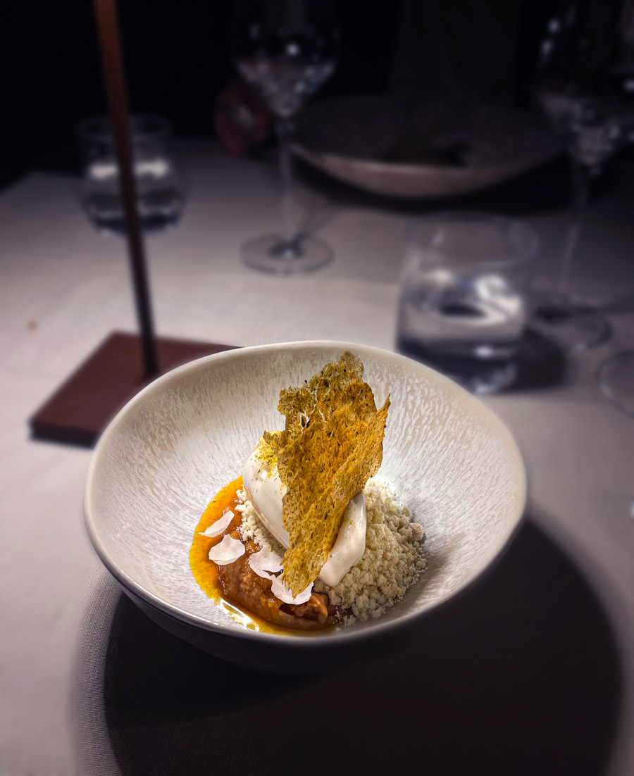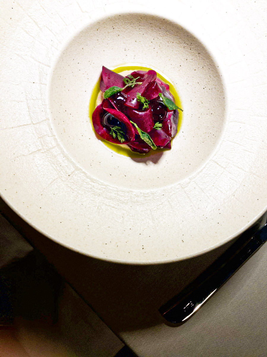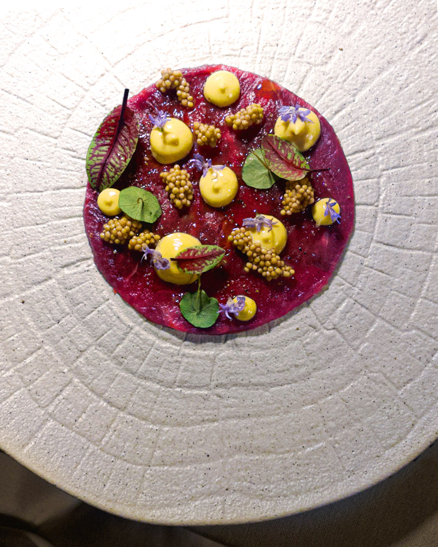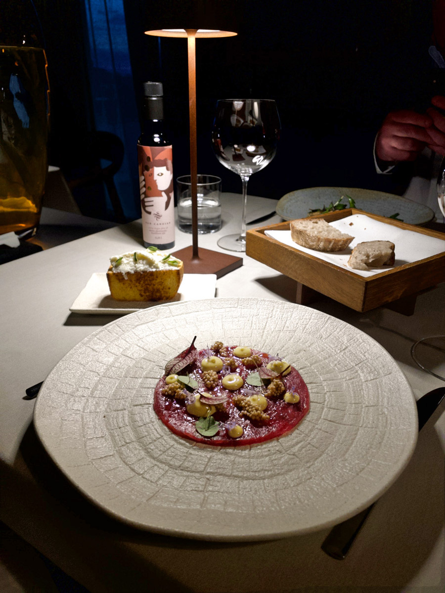 Carpaccio od boškarina, namjerno rezan deblje nego što je uobičajeno, poslužuje se s izvrsnim kajmakom na briošu. Dugo fermentirana cikla ima atraktivnu, gotovo hrskavu, neciklastu teksturu koja dobro funkcionira s humusom na koji je položena.