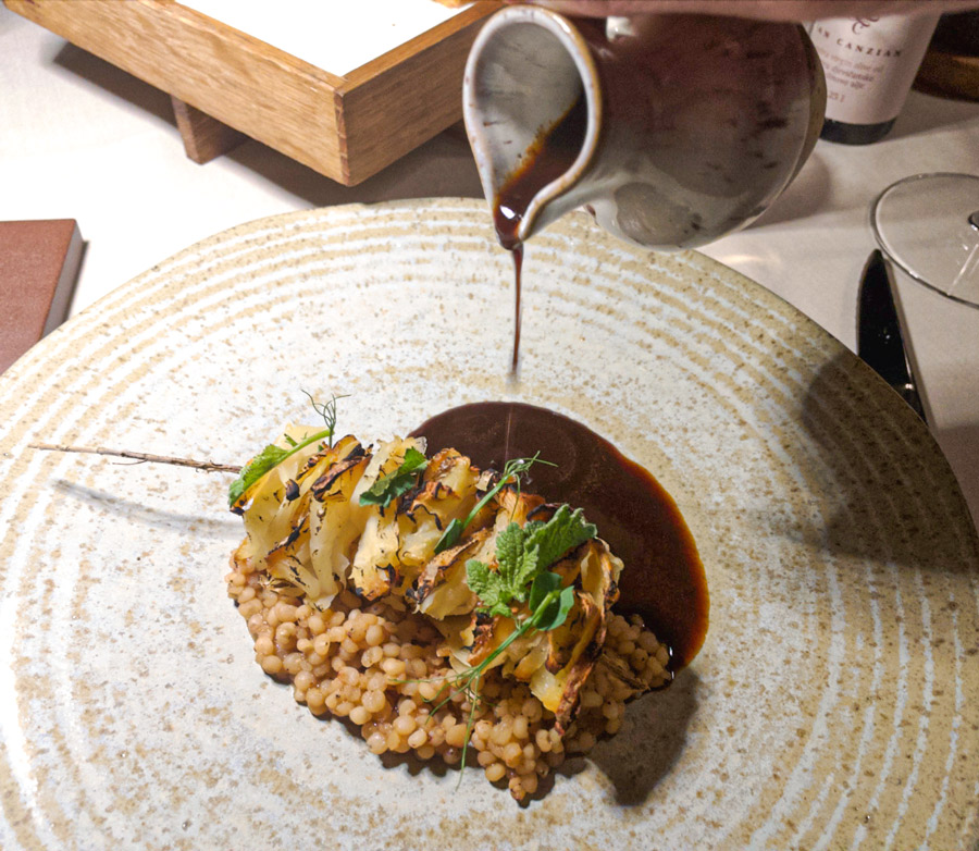 U soli pečeni i paljeni celer na sirku serviran s povrtnim demi glaceom sjajno je, bogato vegansko jelo: demi glace pun čistih okusa gljiva i karameliziranog luka spada među bolje “klasične” umake koje smo u zadnje vrijeme probali u Hrvatskoj. Medaljoni sabljarke primjer su čistih, raskošnih ribljih proteina. Lucianov kraće fermentirani raženi kiseli kruh toliko je neodoljiv da smo zamalo pojeli dvije košarice.