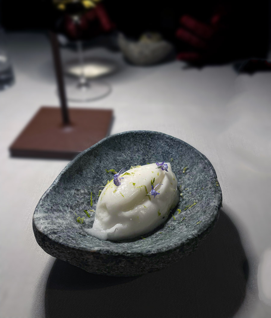 Večeru smo počeli kolekcijom pozdrava iz kuhinje: lardo na čipsu od zobi, krema od ovčjeg sira i žele od maslinova ulja s prahom lovora bili su ukusni, zanimljivi i lijepi.