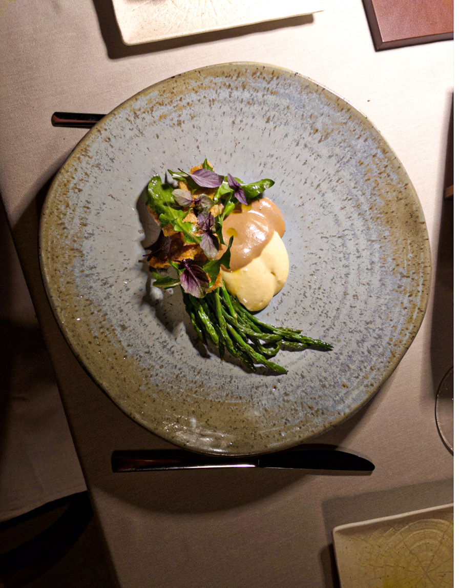 Divlje šparoge s custardom od kozjeg jogurta i kremom od oraha doslovno su fenomenalne: Klarić je povezao žestoki okus istarskih šparoga s jednako žestokim okusom kozjeg jogurta tako da je ovo jelo, bazirano na dva opaka sastojka, na kraju ispalo ne samo ekspresivno nego i elegantno . Tajna je u naglašeno kremastim teksturama oba umaka, koje su poslužile kao amortizer za jake okuse.