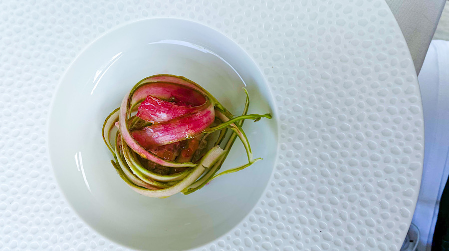 Miloševa je rakovica omotana dugim tankim trakama sirovih vrtnih šparoga obogaćenih crvenim prahom cikle, koji je dao završni vizualni kontrast ovom fenomenalnom jelu. Belizar Miloš, naprosto, zna kuhati.