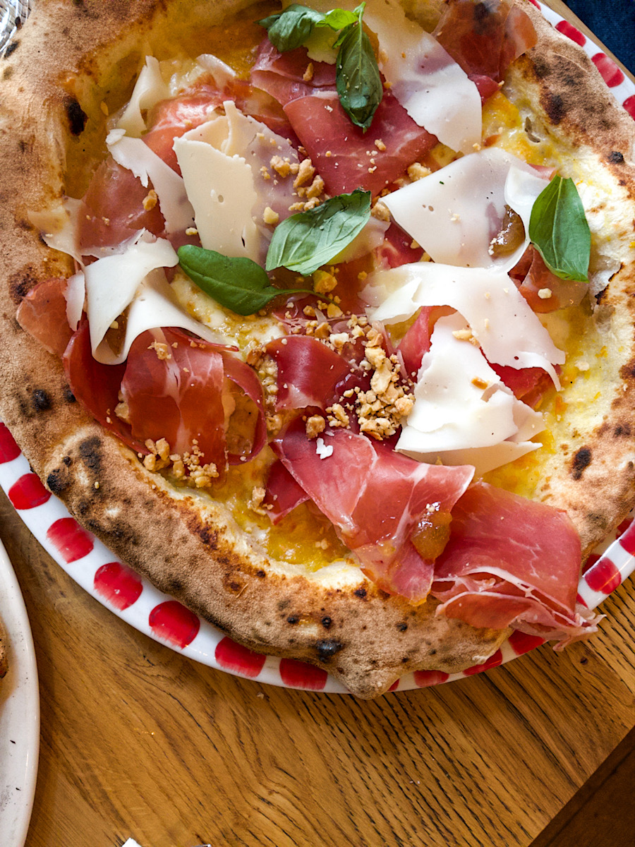 Naručili smo Campione del Mondo, m svjetskog prvaka iz 2019. koji uz pršut, provolone, mozzarellu i slatko kisele žute datterine sadrži tostirane hrskave bademe i marmeladu od smokava.