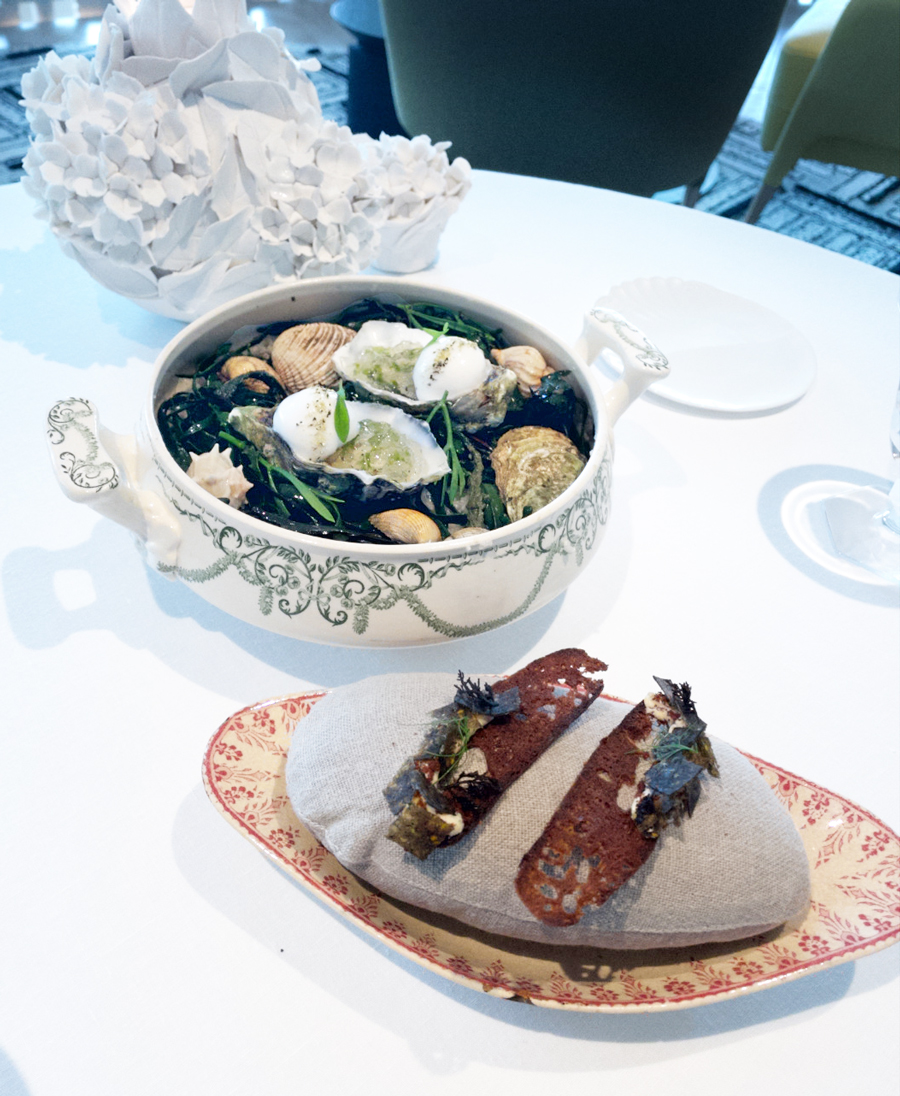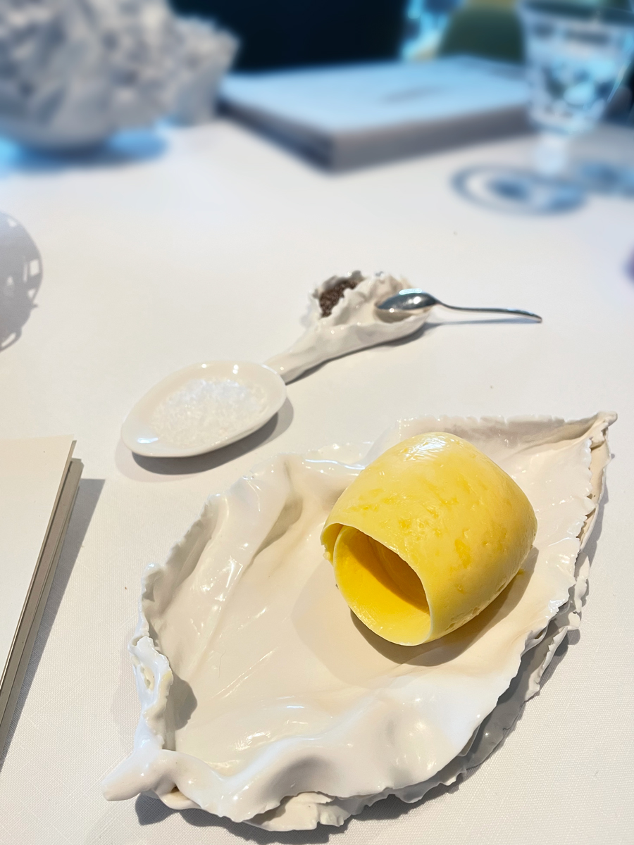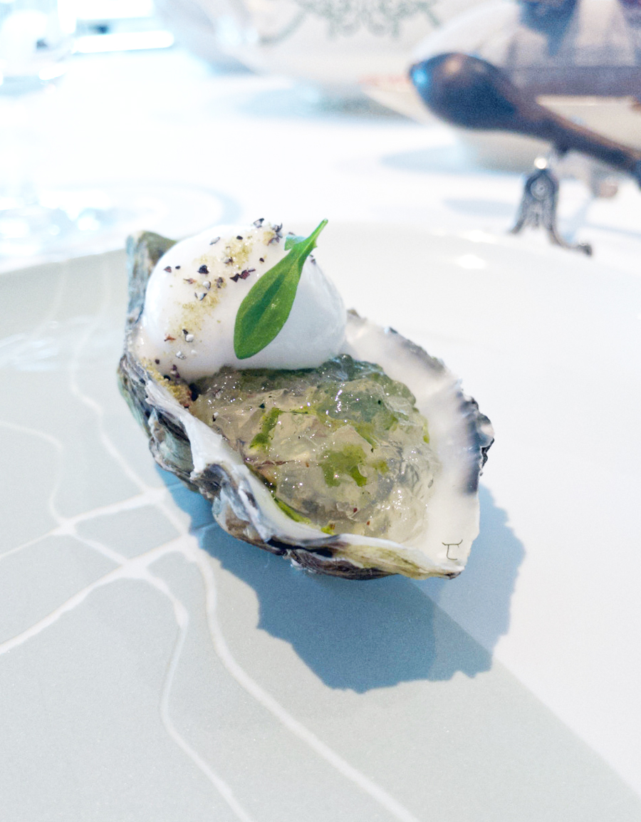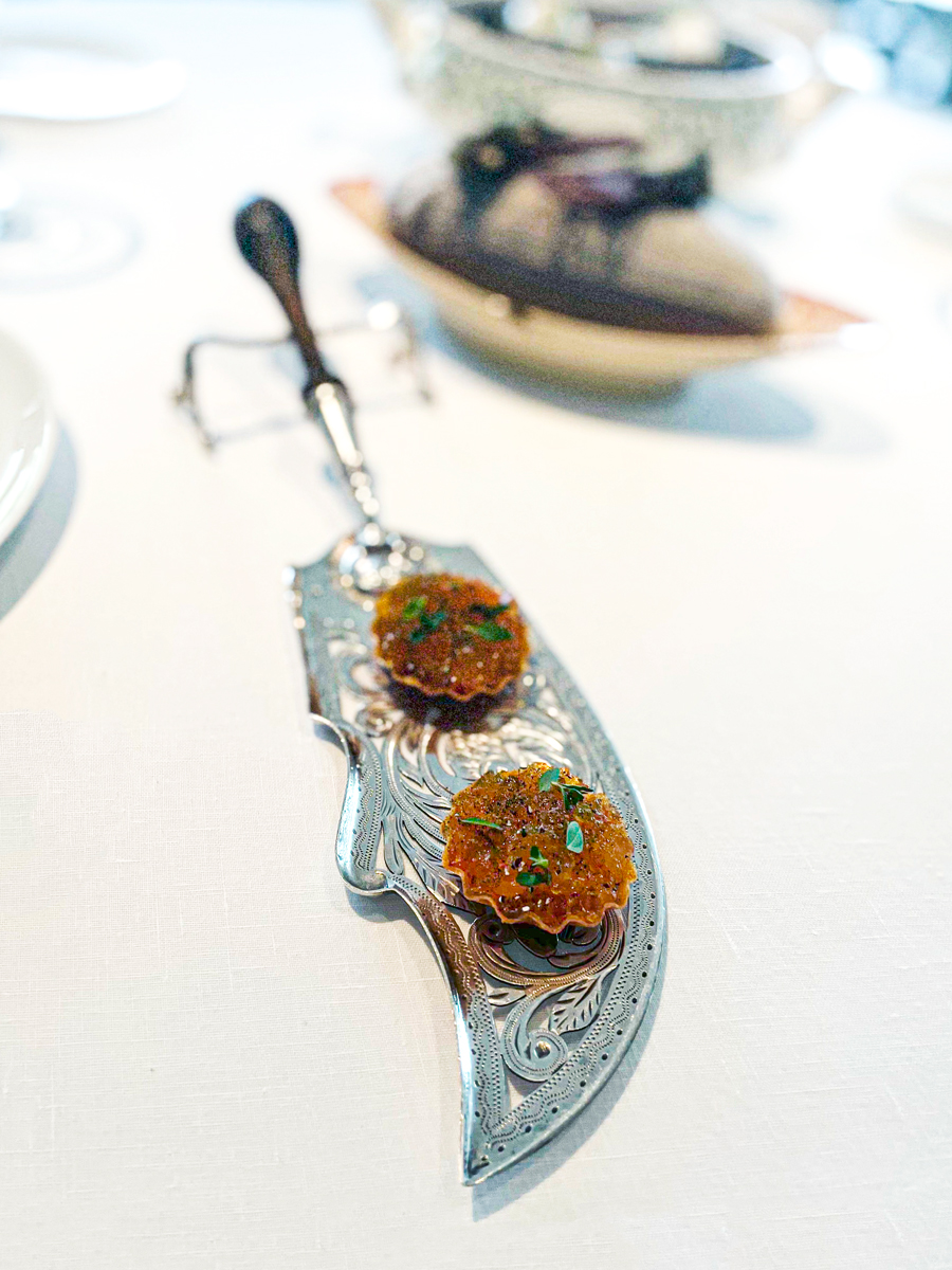 Prije nego što smo stigli pogledati jelovnik, na stol su nam došli prvi pozdravi iz kuhinje. Kamenice na zelenim jabukama sa zabajonom od šampanjca imale su, dakle, najmineralniji okus koji smo ikad iskusili u kamenicama. Mali hrskavi tartovi punjeni ikrom škampa bili su gotovo jednako mineralni, ali i jako kremasti.