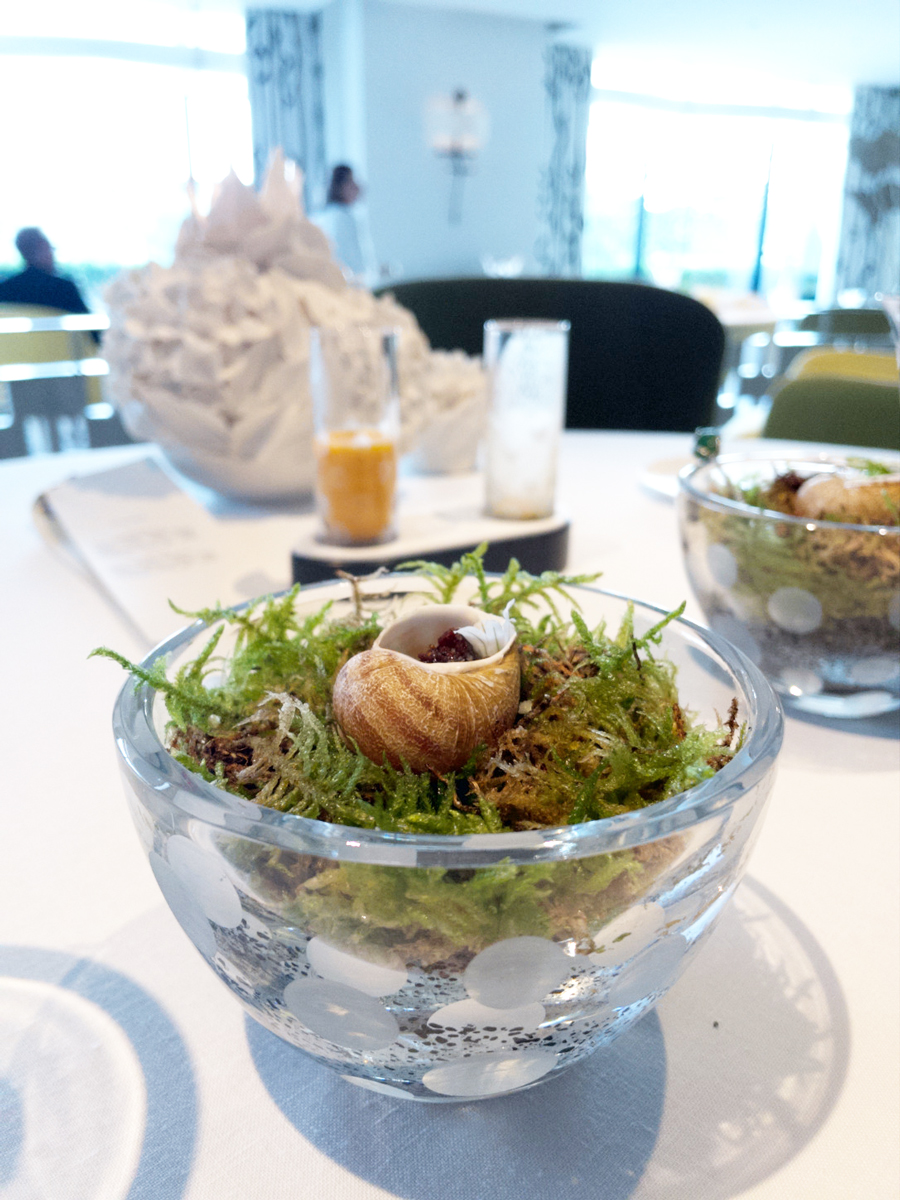 Drugom rundom pozdrava iz kuhinje dominirao je pečeni puž serviran u oklopu, s epruvetom punom jusa od škampa i citrusa.