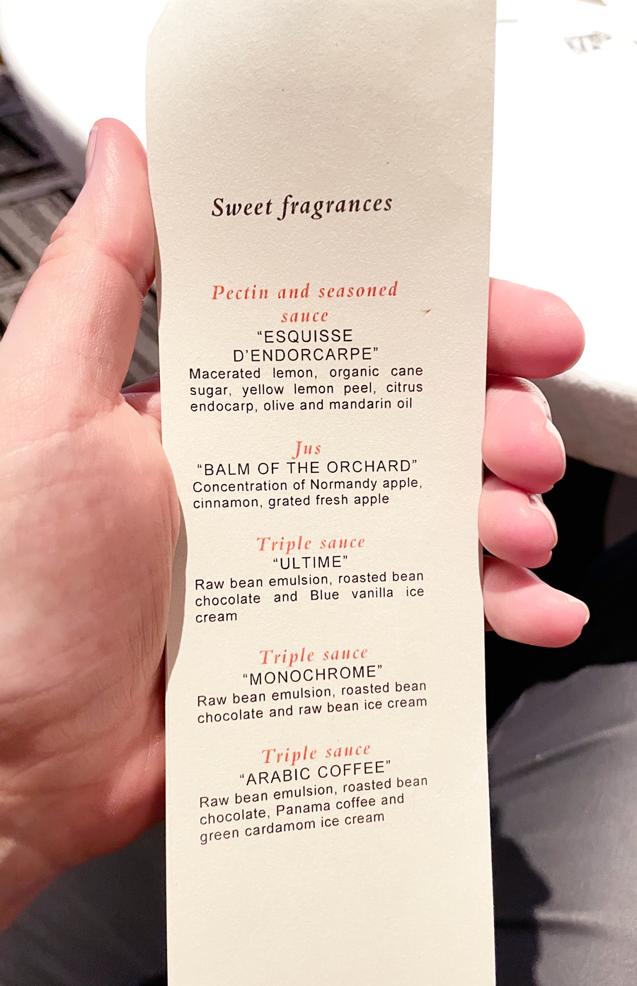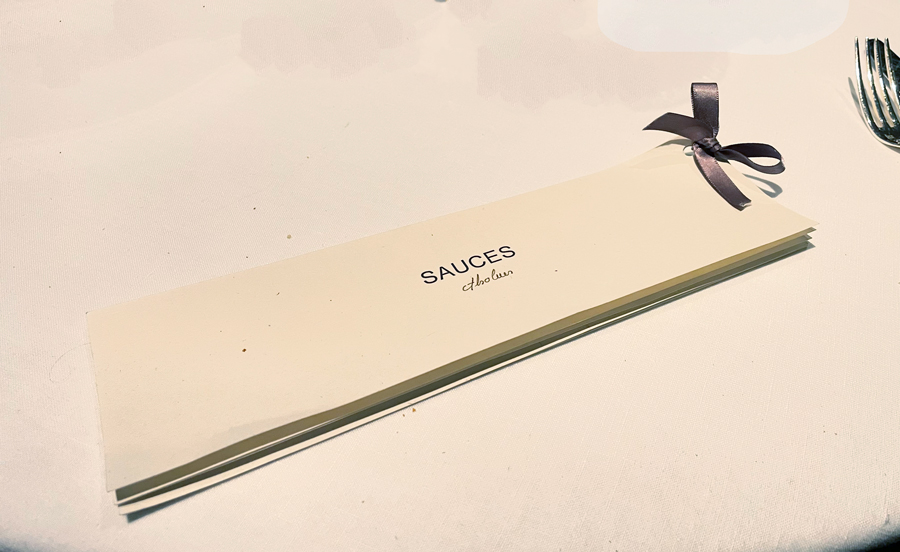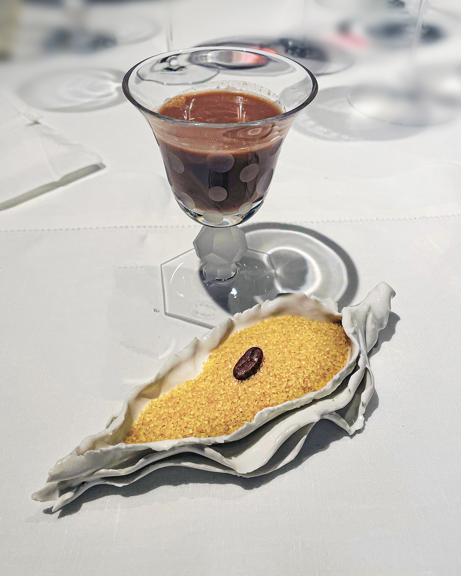 Kao i ostala jela na meniju, deserti su podređeni umacima i serviraju se s umacima i sladoledima sa strane. Zbog Frédéricova čokolatijerskog prestiža, čokoladni desert jedini je uz koji gosti mogu birati između tri umaka, vanilije (Ultime), kave (Arabic Coffee) i čokolade (Monochrome). Naručili smo Arabic Coffee, koji počinje vodom od kakaa i začina koja se poslužuje uz jedno, savršeno hrskavo i mirisno zrno kave servirano u školjki sa šećerom.
