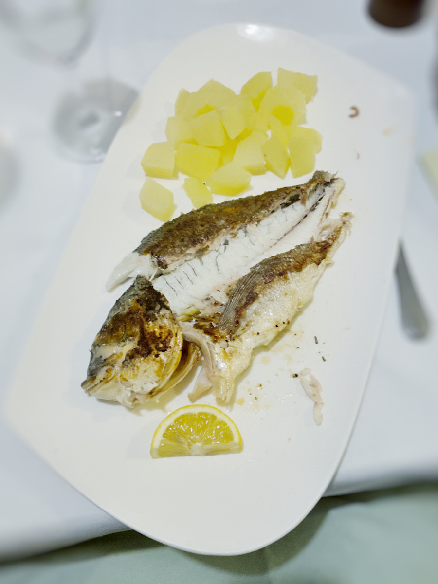 Na tanjuru smo dobili uglavnom očišćenu ribu s kockicama krumpira: nema peršina ni bilo čega zelenog, nema maslaca na krumpiru, nema nikakvih umaka, dodanog maslinova ulja…nema ničega. Sama, gola riba na tanjuru. Ali, riba je bila izvrsna. Dobra, čista, jednostavna hrana.