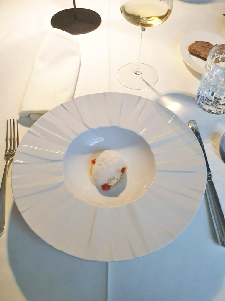 Zatim smo dobili jadranskog škampa s rajčicom i limunskom travom. Ovdje Bratovž i njegov tim pokazuju izvanredno tretiranje namirnica. Mnogo kuhinja kombinira škampe i limune, no kod većine njih se škamp uguši u limunu i ne osjetite ništa drugo. Ovdje to nije bio slučaj. Svaki sastojak je izbalansiran s ostalima i nijedan ne dominira niti odskače. Sa sljedećim tanjurom Bratovž će mnoge vratiti u djetinjstvo. Palenta, ovčji sir iz okolice Ljubljane i šparoge kao sezonska namirnica koja ovdje ima smisla, uz dodatak čipsa od iste palente. Moramo priznati kako jako dugo vremena nismo probali bolju palentu i lijepo je kako je Bratovž od namirnice koja je inače zanemarena i smatra se inferiornom, napravio zaseban slijed i to veoma uspješno.