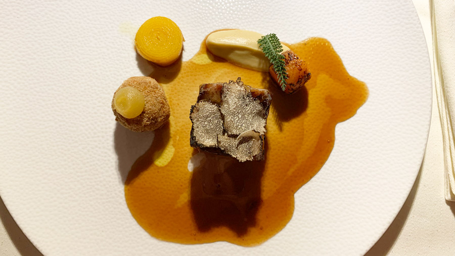 Zatim smo dobili jadranskog škampa s rajčicom i limunskom travom. Ovdje Bratovž i njegov tim pokazuju izvanredno tretiranje namirnica. Mnogo kuhinja kombinira škampe i limune, no kod većine njih se škamp uguši u limunu i ne osjetite ništa drugo. Ovdje to nije bio slučaj. Svaki sastojak je izbalansiran s ostalima i nijedan ne dominira niti odskače. Sa sljedećim tanjurom Bratovž će mnoge vratiti u djetinjstvo. Palenta, ovčji sir iz okolice Ljubljane i šparoge kao sezonska namirnica koja ovdje ima smisla, uz dodatak čipsa od iste palente. Moramo priznati kako jako dugo vremena nismo probali bolju palentu i lijepo je kako je Bratovž od namirnice koja je inače zanemarena i smatra se inferiornom, napravio zaseban slijed i to veoma uspješno.
