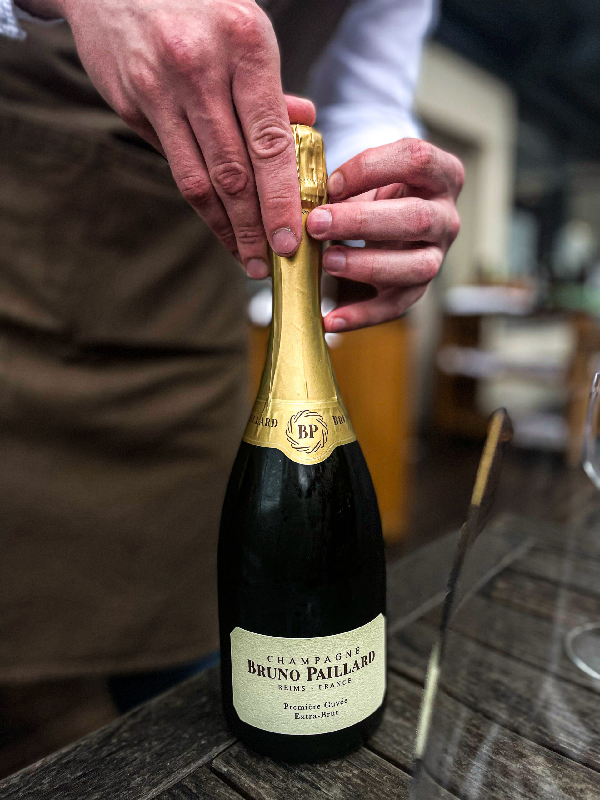 Topli val je hotel s restoranom i vinskim barom u centru Kobarida, pet minuta vožnje od Hiše Franko. U srijedu popodne između posjeta robinzonskoj obitelji koja usred ničega uzgaja ekološko povrće za Anu Roš i večere u Hiši Franko, sjeli smo na popodnevno piće u Topli val. Koji drži četiri šampanjca i pjenušca i više od deset mirnih vina na čaše. Naručili smo Bruna Paillarda, koji spada među naše omiljene aperitivne šampanjce . E sada, uz dvije čaše šampanjca donijeli su nam vjerovali ili ne, svježe kamenice.