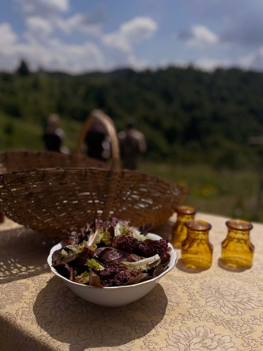 Oko dva popodne Jeanne i Matteo poslužili su nam ručak na klimavom drvenom stolu u nevjerojatnom mirnom ugođaju njihova povrtnjaka i moćne prirode Julijskih Alpi. Pili smo izvrsni Matteov oranž od chardonnaya iz kasne berbe s mekih 16 posto alkohola i jeli sir kojeg je Jeanne napravila prethodnu večer. Uz sir je servirala  chutney od jabuka. Zatim je donijela zdjelu beluga leće s netom ubranim zelenim povrćem, kuhanu u sirutki od svog sira. Teško da može zdravije i autentičnije.