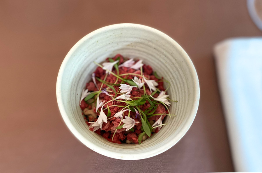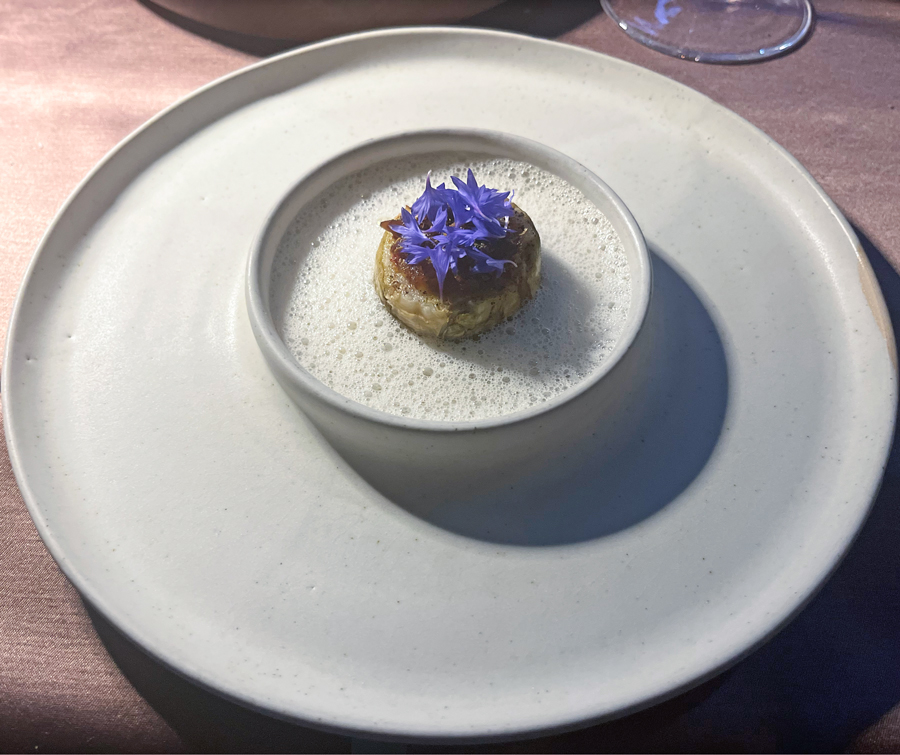 Večeru smo počeli Pol Rogerom koji u Ateljeu toče na čaše. Šampanjac je išao idealno uz prvi pozdrav iz kuhinje, kamenice sa celerom, krostatom od kavijara i bavarske kreme i tramezinima. Ostatak ovog velikog i lijepog pozdrava nije nas oduševio. Pileća krilca su stvorila neugodnu paštetu, a uz ikru i creme fraiche bi voljeli kakav brioche ili kruh. Prvi slijed voljeli bismo jesti za doručak gotovo svaki dan. Zdravo i zabavno. Cikla u tekućem dušiku, foie gras, espuma, svježi sir i granola od lješnjaka.