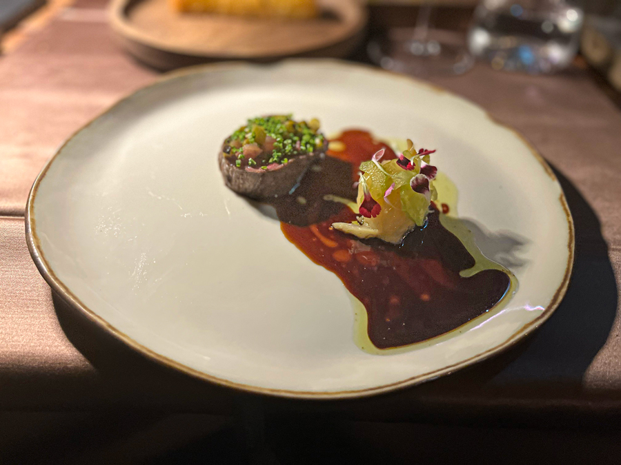 Novi slijed malo nam je pokvario dojam. Kupus, xo umak i veloute umak. Za razliku od prošlog slijeda koji je sadržavao samo povrće-poriluk, ovaj nije uspio. Previše kiseline, a i konceptualno nam ovako nešto više odgovara zimi. Za kasno proljeće i vrućine koje su nas zahvatile ipak bismo radije jeli nešto laganije i osvježavajuće. Za glavno jelo smo dobili odležanu govedinu, celer na ugljenu i goveđi jus s estragonom. Govedina je sama po sebi bila ukusna no mrvicu žvakava spokojom žilicom, celer je solidno išao uz meso, no kroz cijelu večeru osjetili smo preveliki naglasak na celeru.