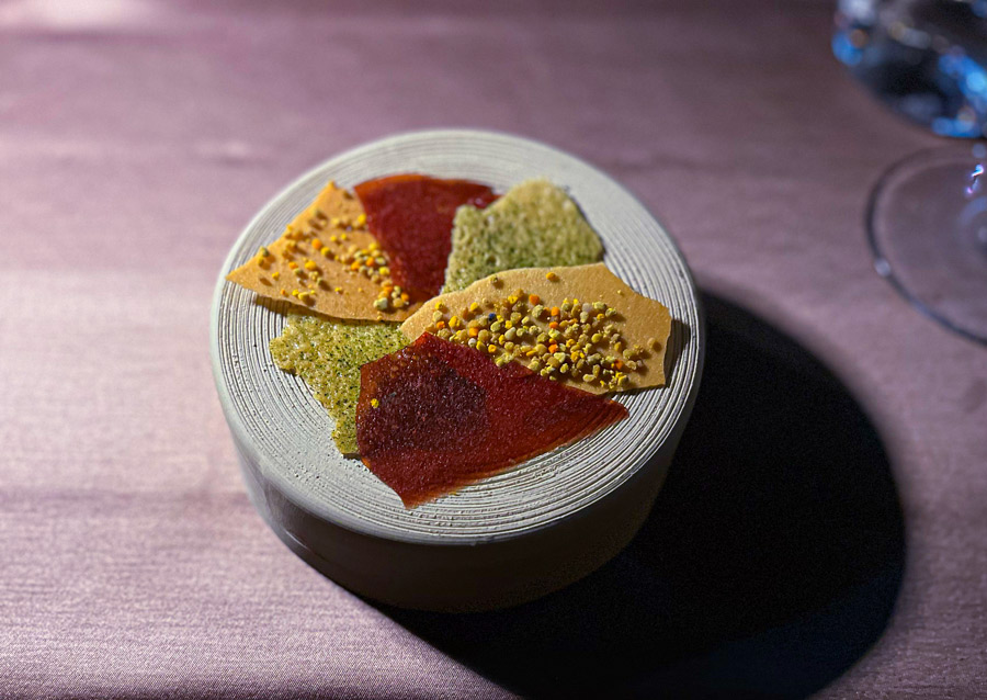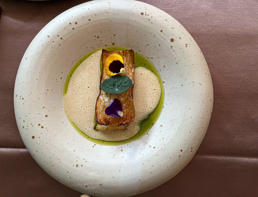 Pileća kožica mogla je biti nešto hrskavija, a uz ovaj slijed trebala je ići Ateljeova domaća foccacia od krumpira koja je inače odlična. Atelje ponosno naglašava svoj vrt udaljen pet minuta vožnje od centra grada na kojem radi majstor iz Teksasa i tim od pet ljudi. Iz tog vrta dolazi i poriluk koji Atelje koristi u jelu koje zorno odražava njihov zero-waste pristup. Poriluk je poširan, od njega je napravljena i korica hrskava poput čipsa. Uz sve to se dodaje i koji umak, koji jelu daje nevjerojatan umami. Kao riblje jelo dobili smo poširanog brancina s posipom od bukovače, misom, salatom iz vrta i umakom od vina. Deblji file brancina je uzorno pripremljen, putraste teksture i okusa, a salata jedna od boljih koje smo probali, podsjetila nas je na salate iz vrta Luke Košira iz Griča. Ne bi se čudili da Luka i Jorg razmjenjuju znanje o kuhanju i vrtlarstvu jer su veliki prijatelji.
